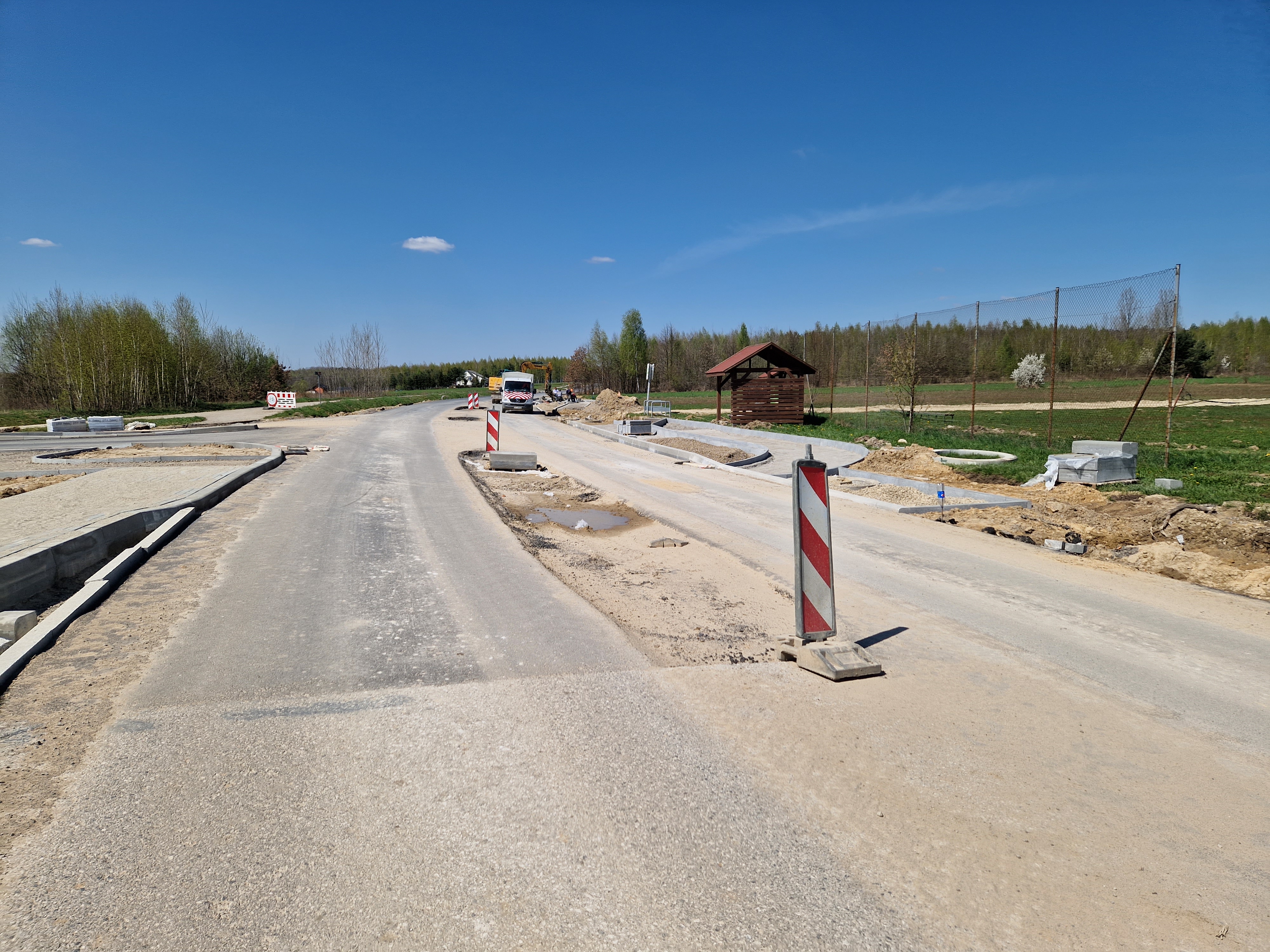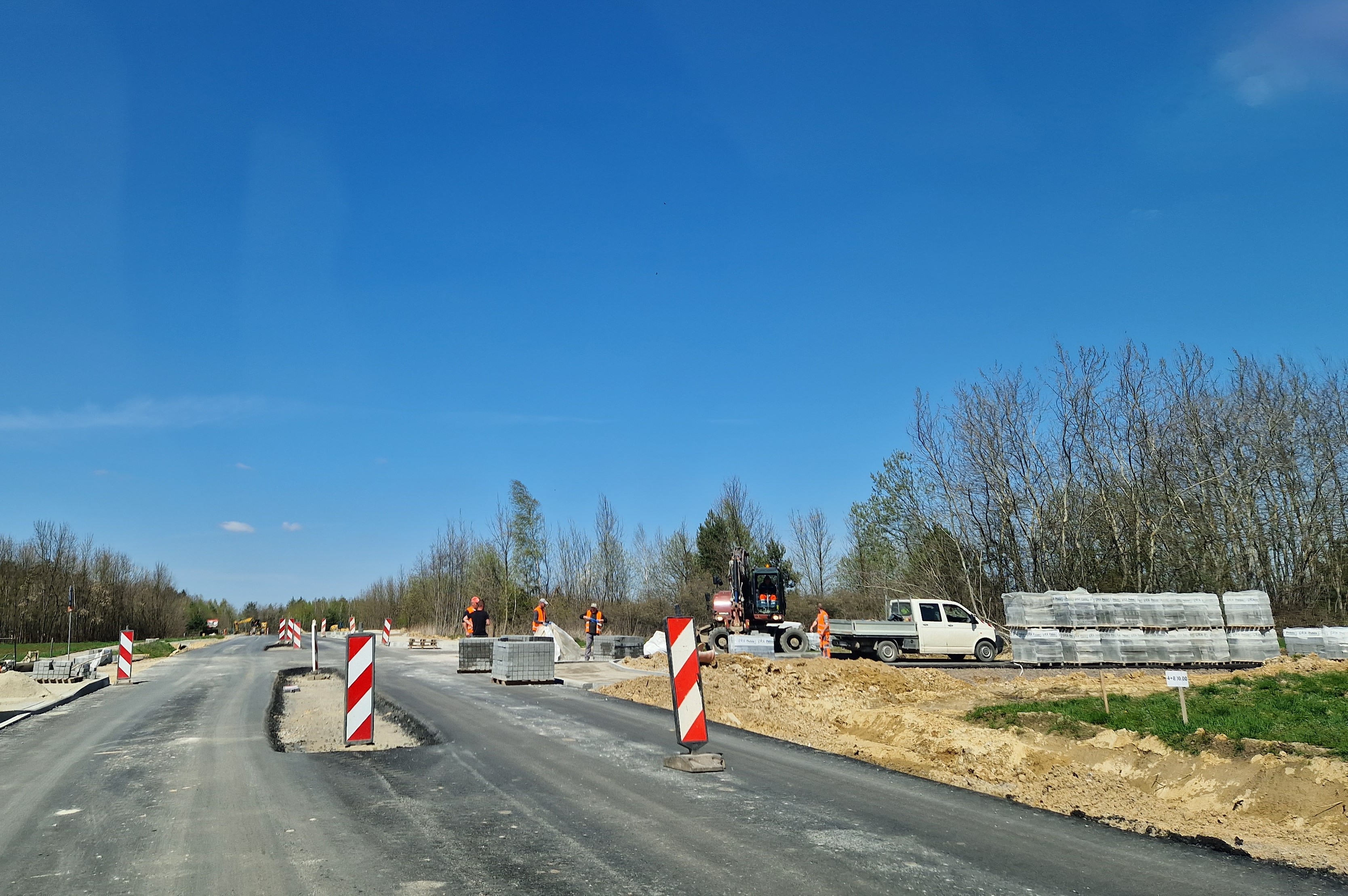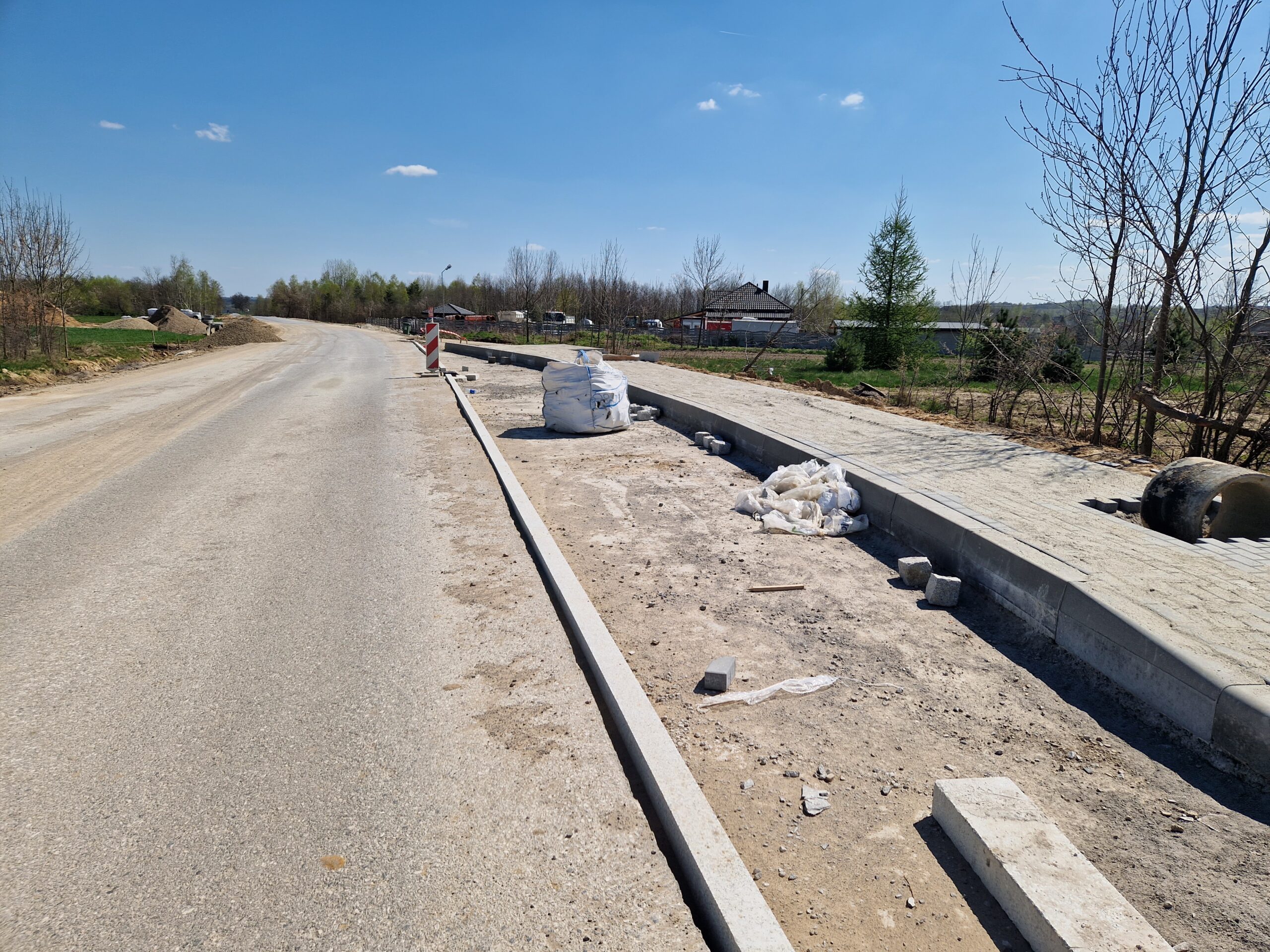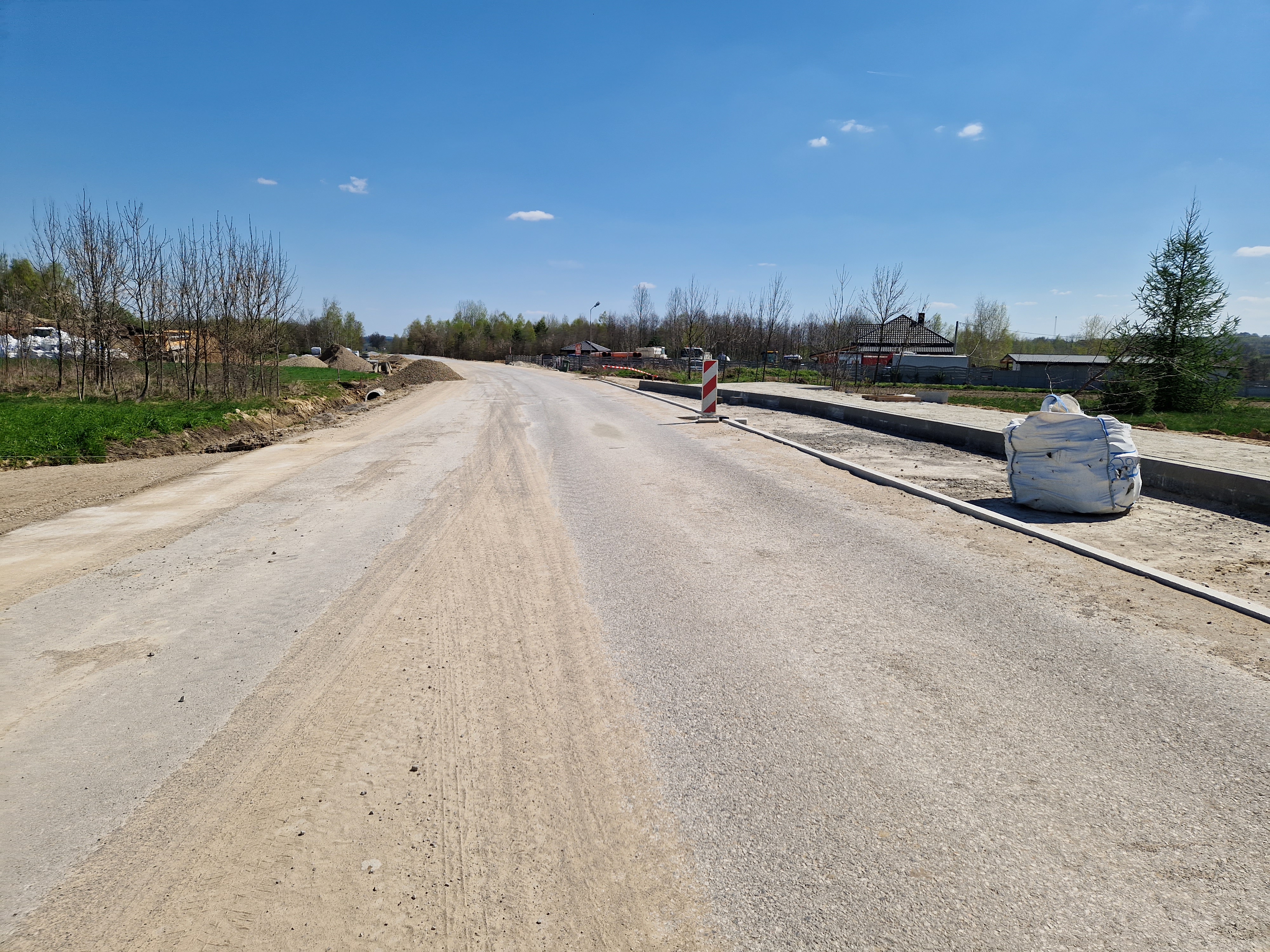 Trwają prace brukarskie, warstwy bitumiczne są ułożone na całej długości drogi. Postęp prac w maju