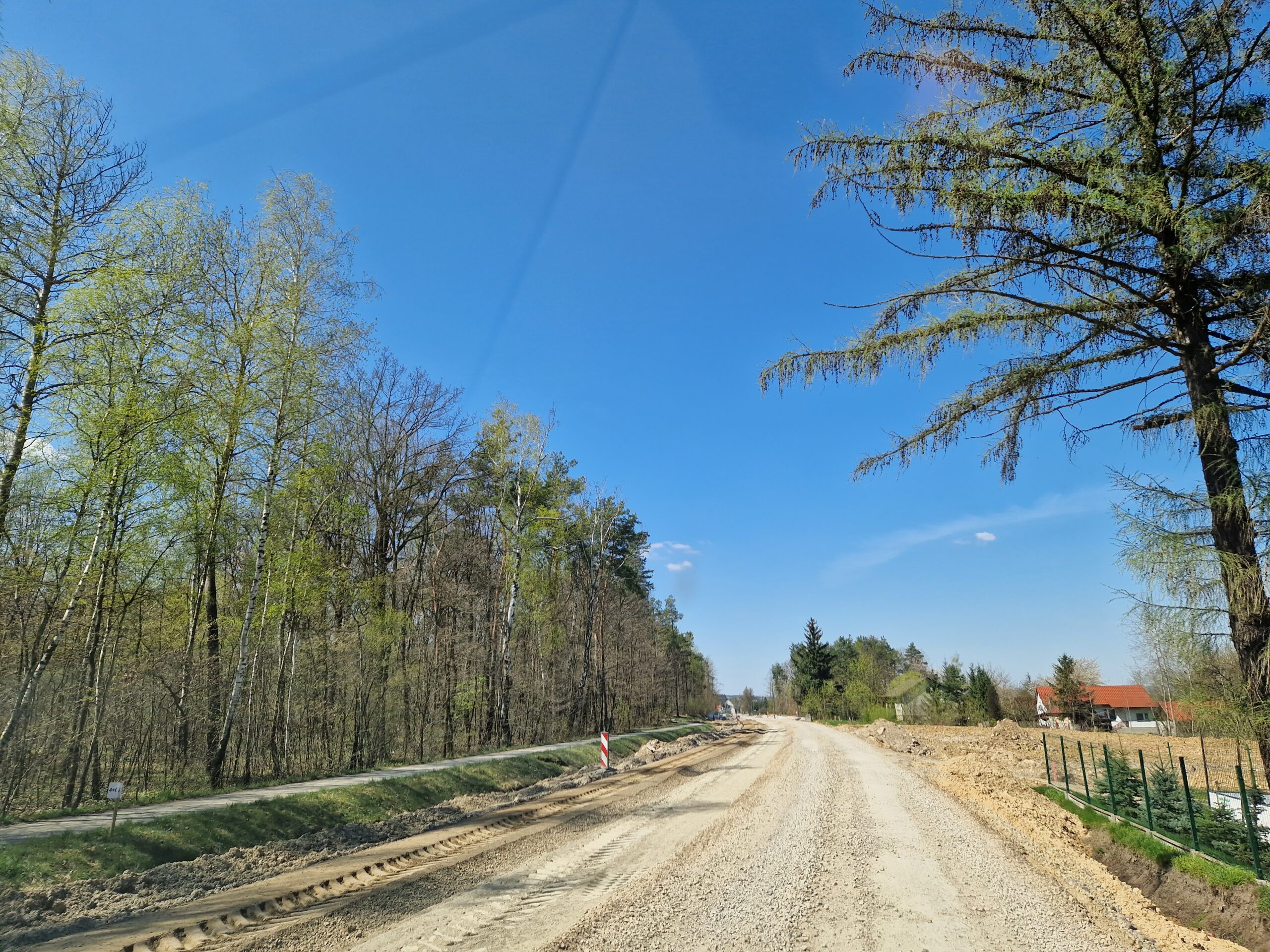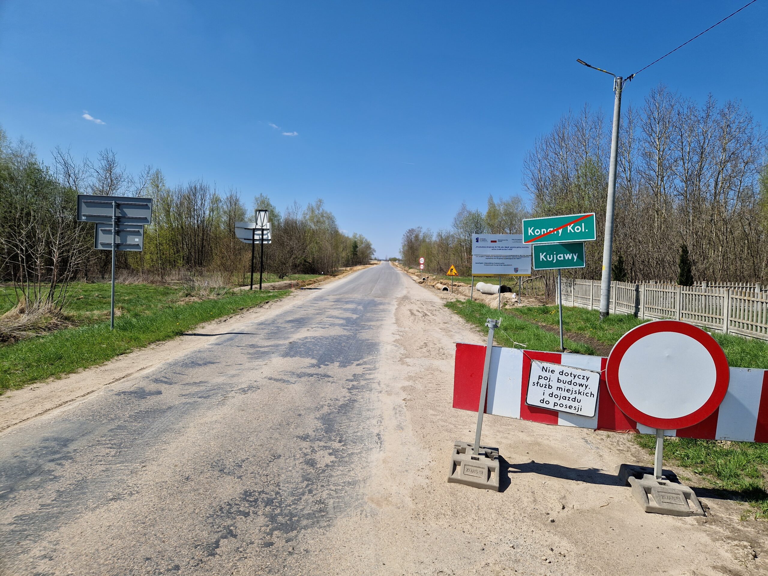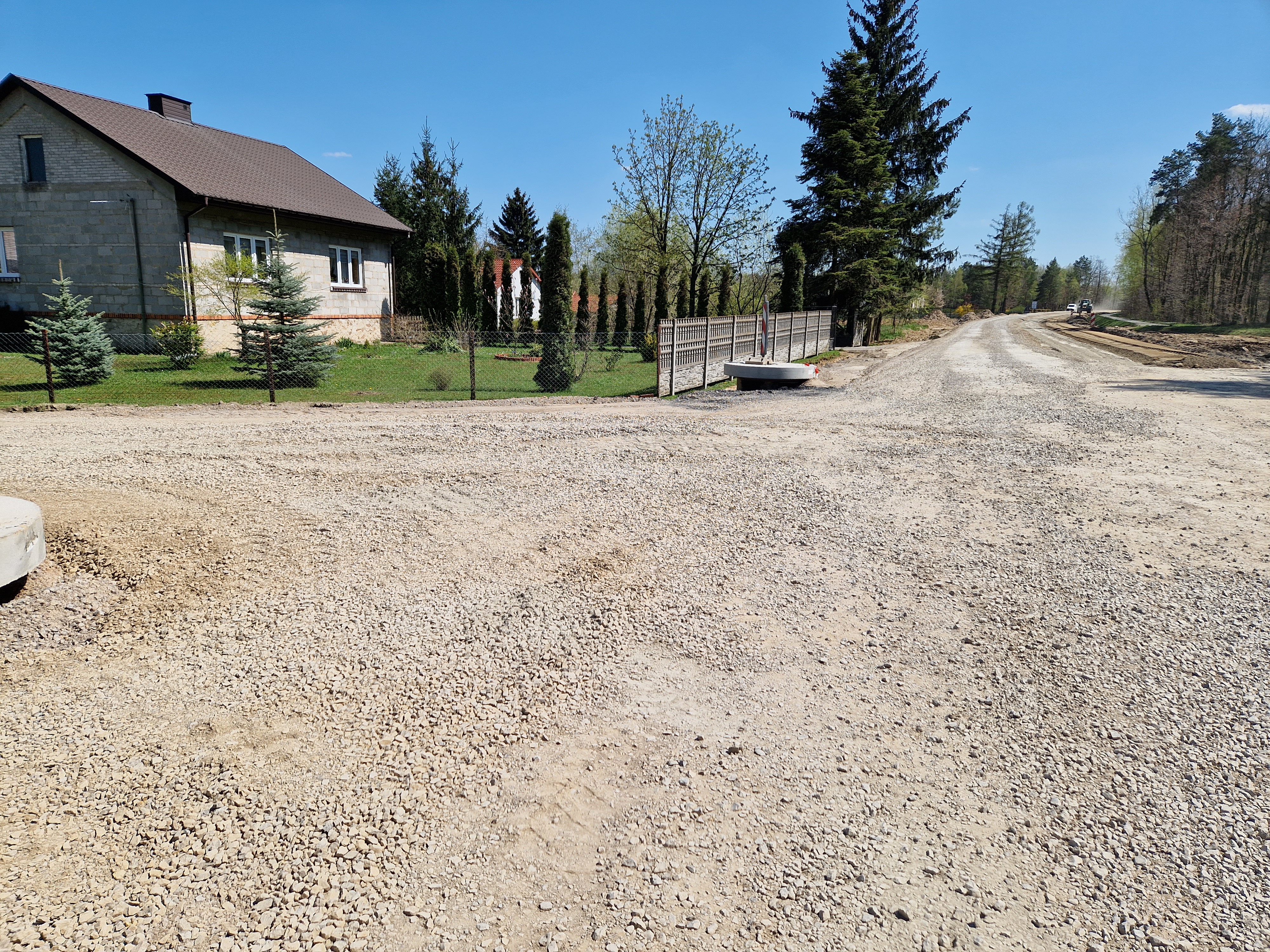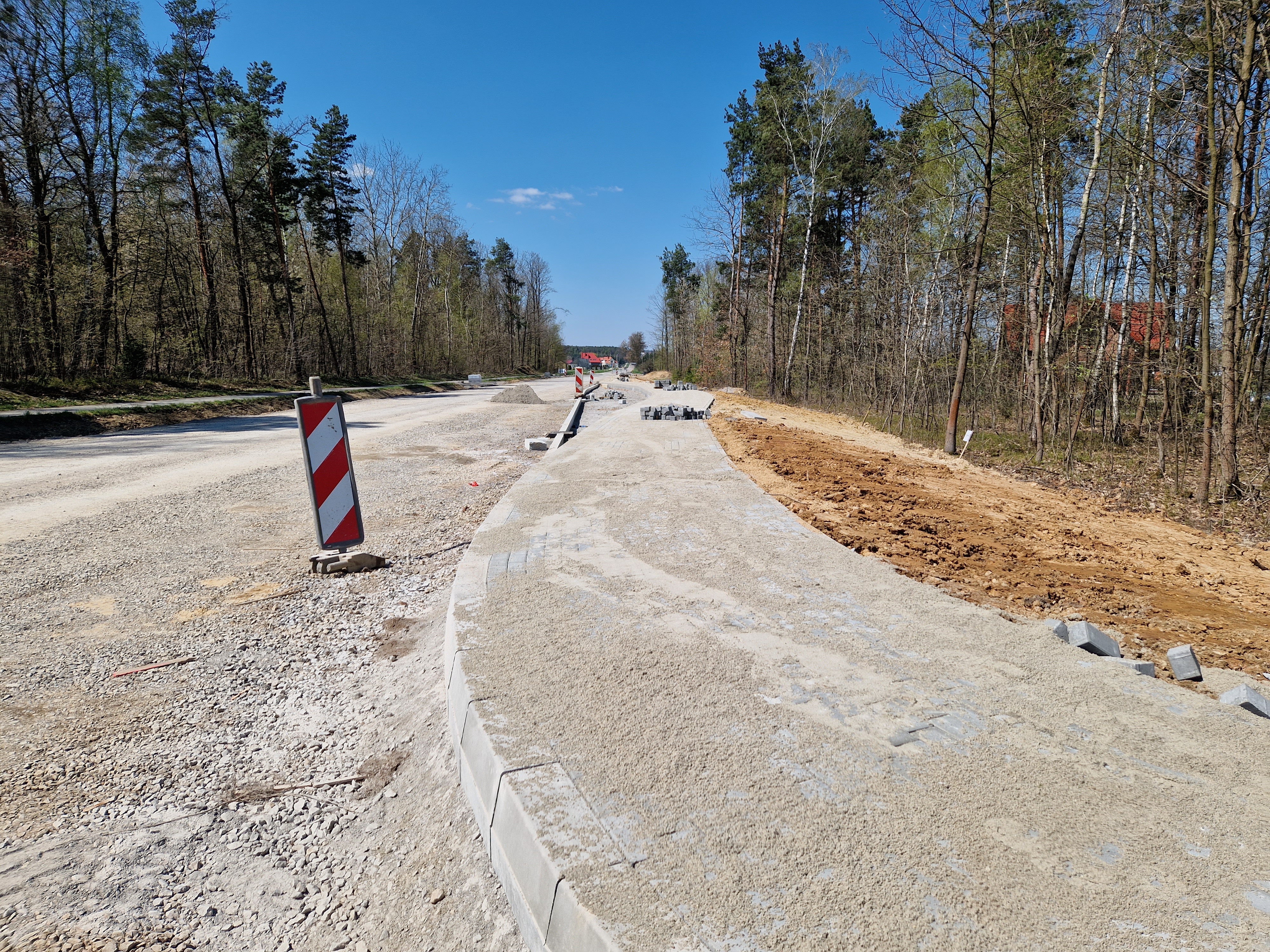 Trwają prace brukarskie, warstwy bitumiczne są ułożone na całej długości drogi. Postęp prac w maju