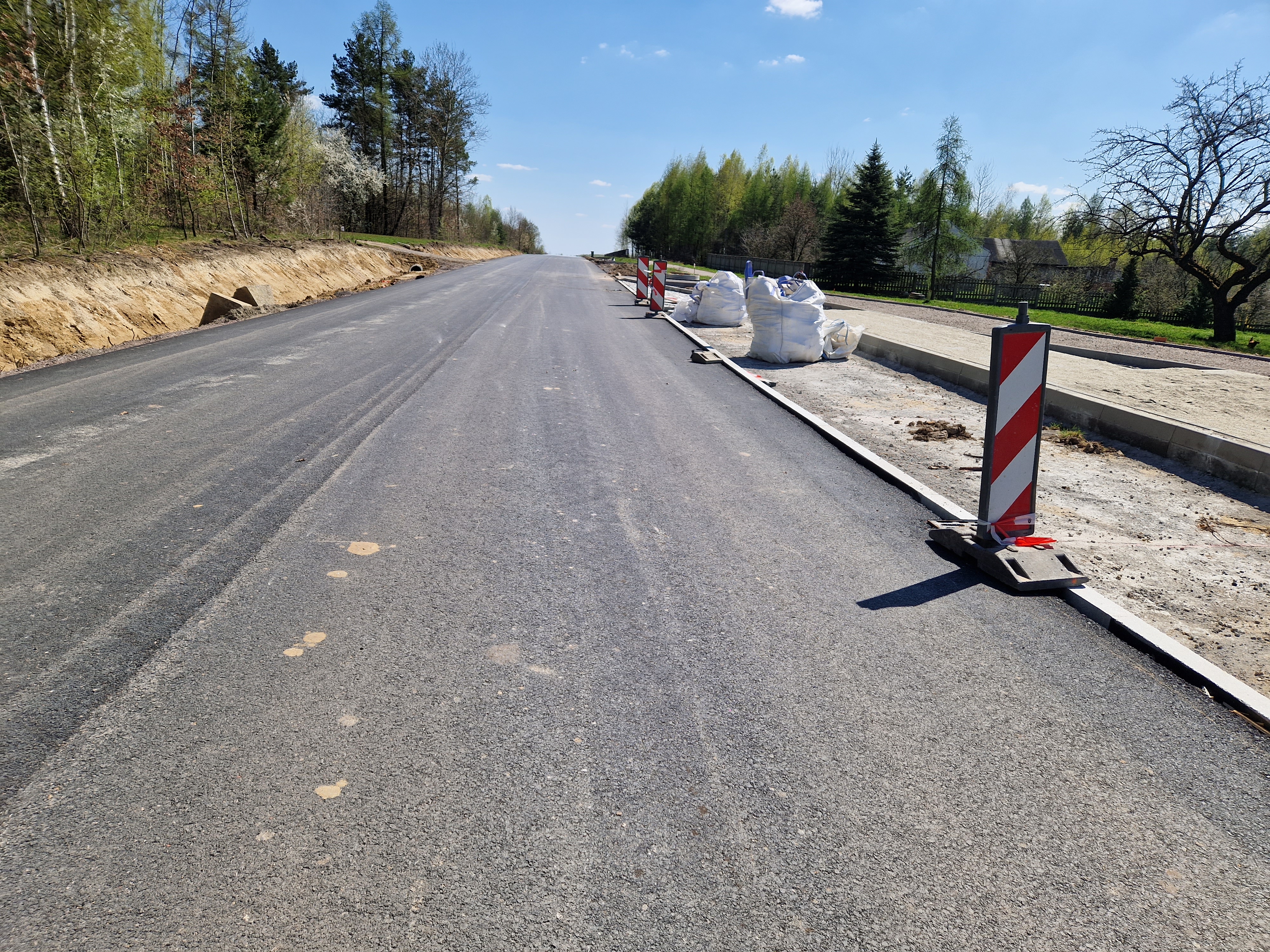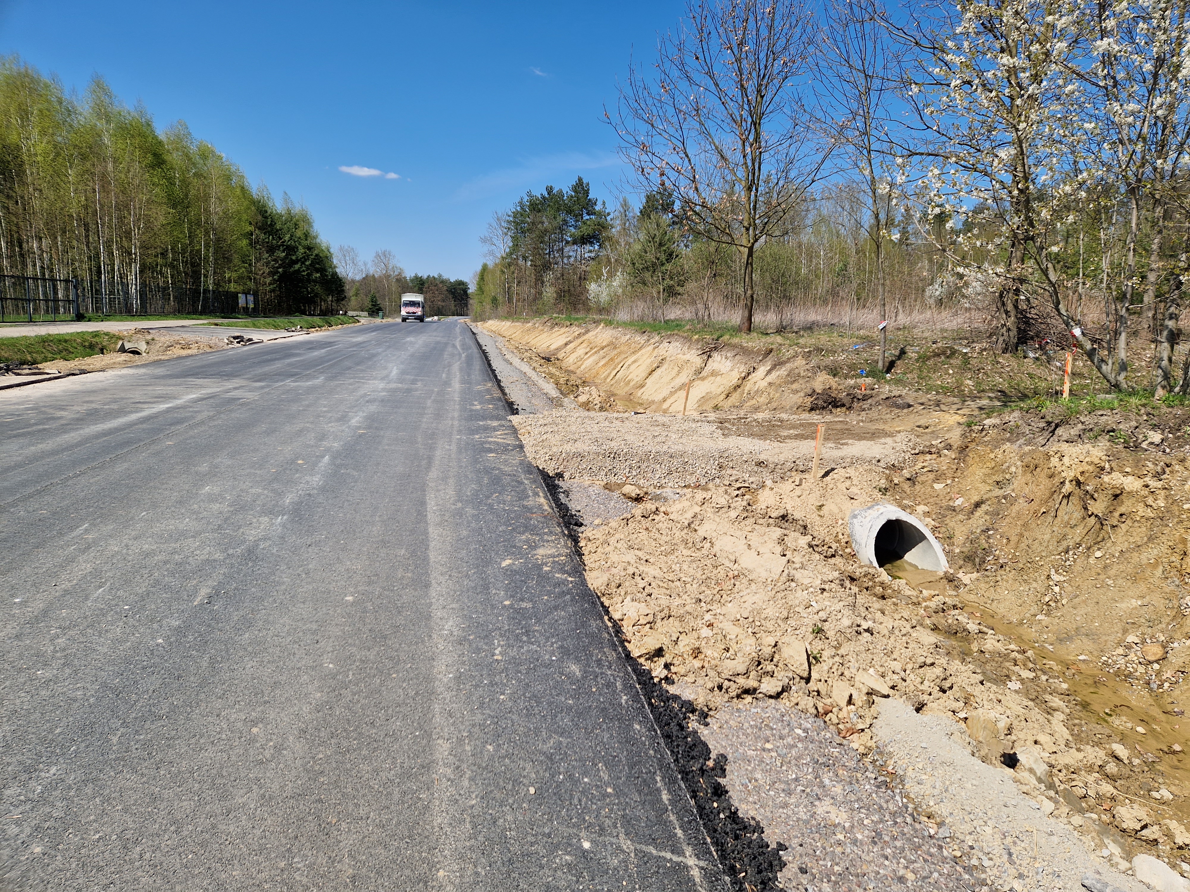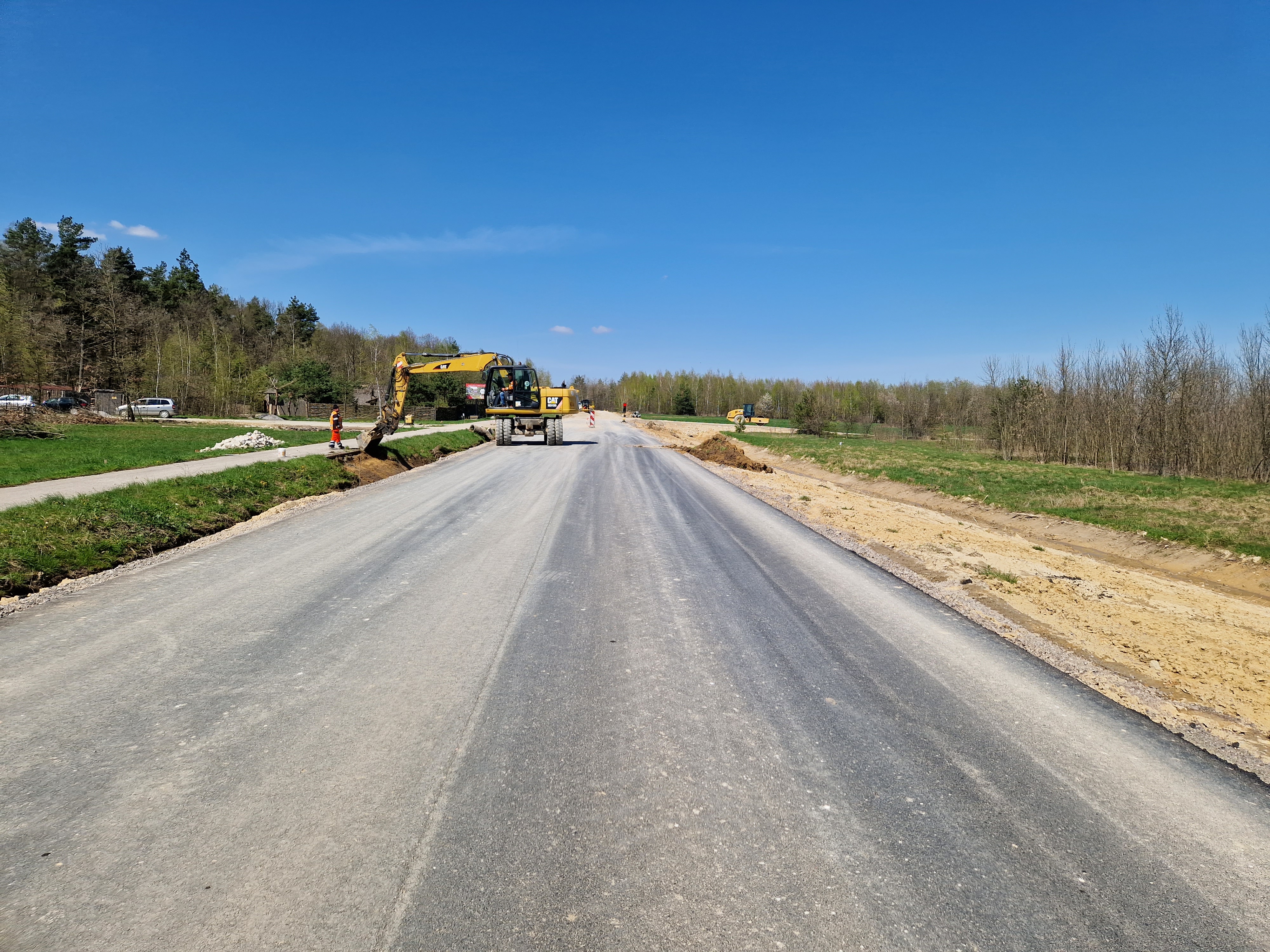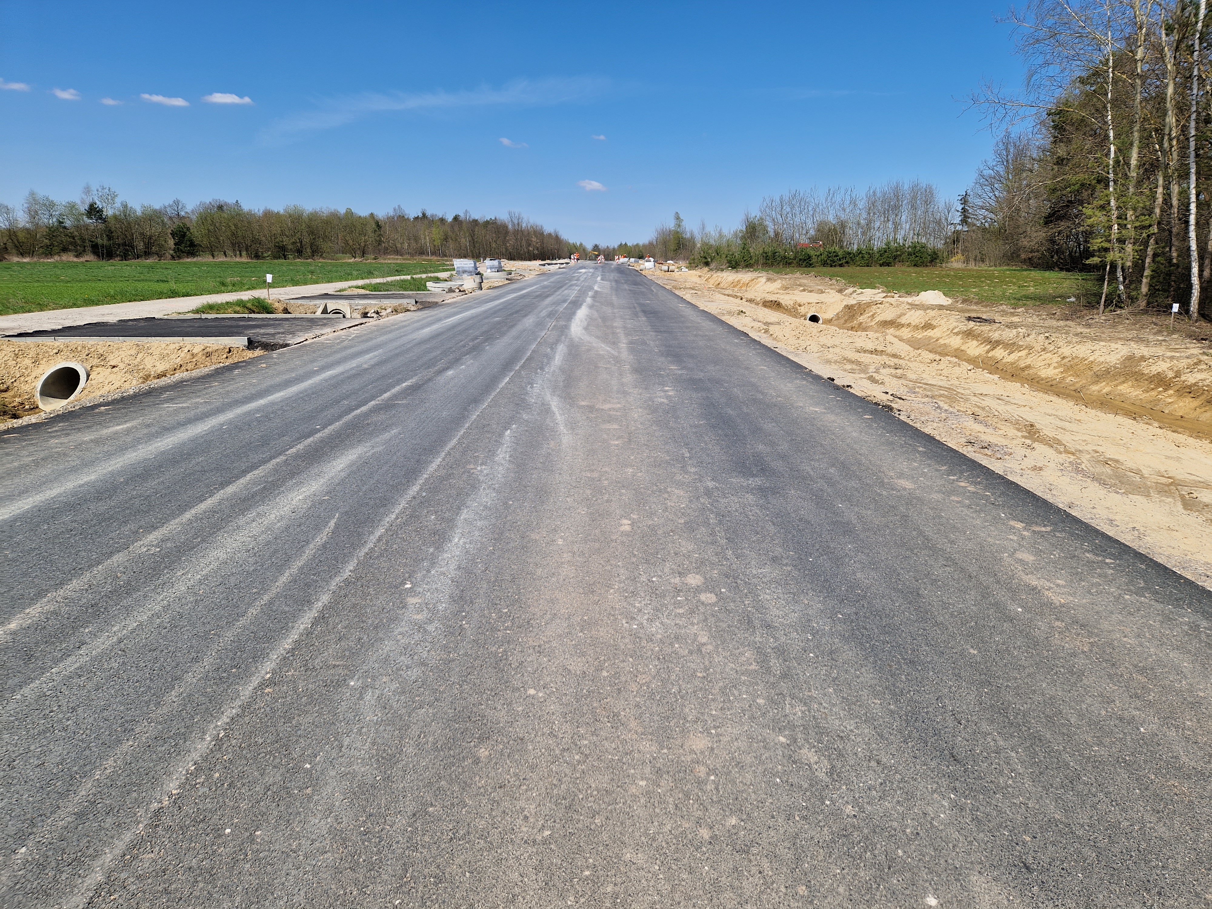 Warstwa bitumiczna ułożona już na większej części drogi. Postęp prac w kwietniu
