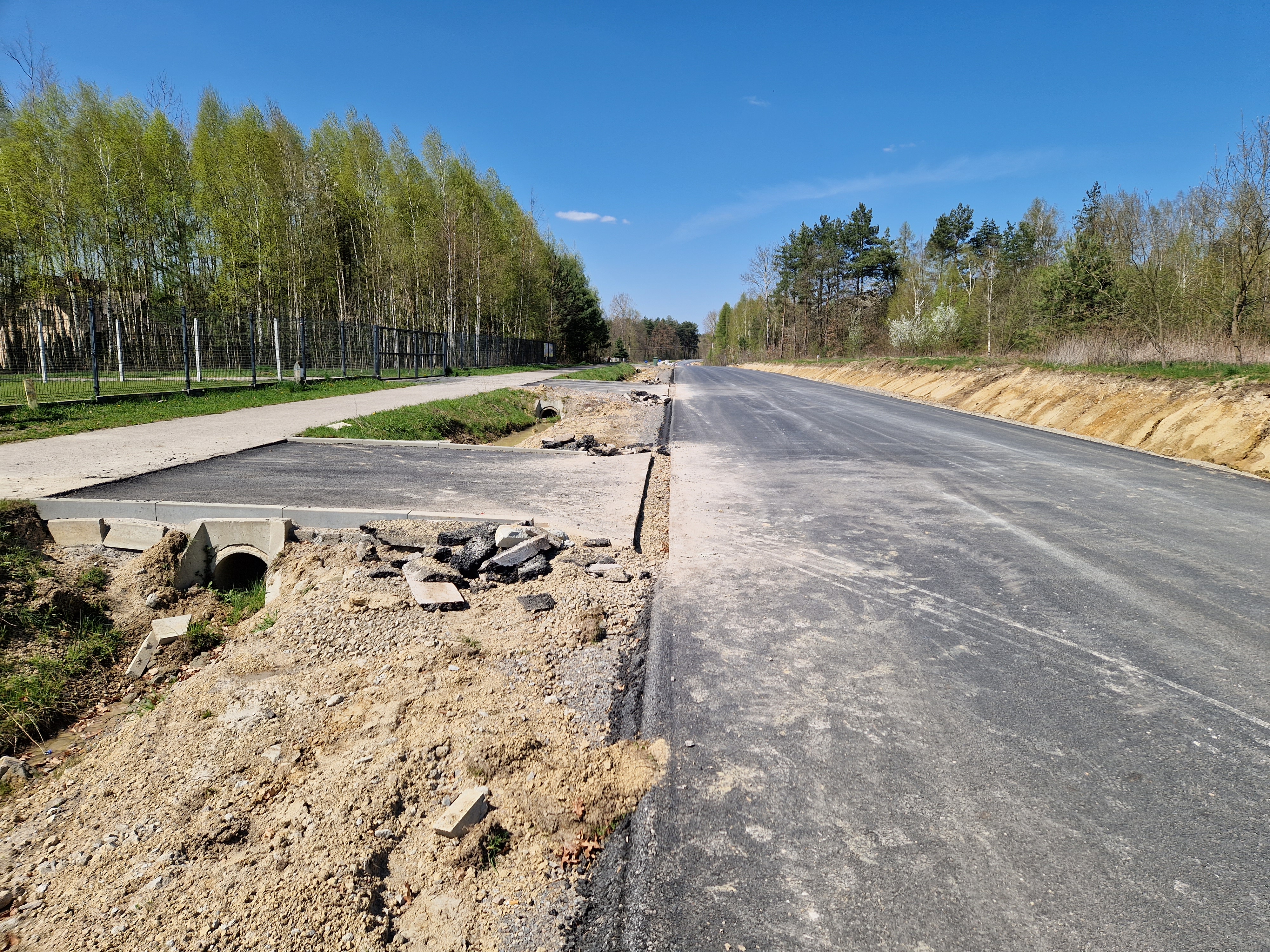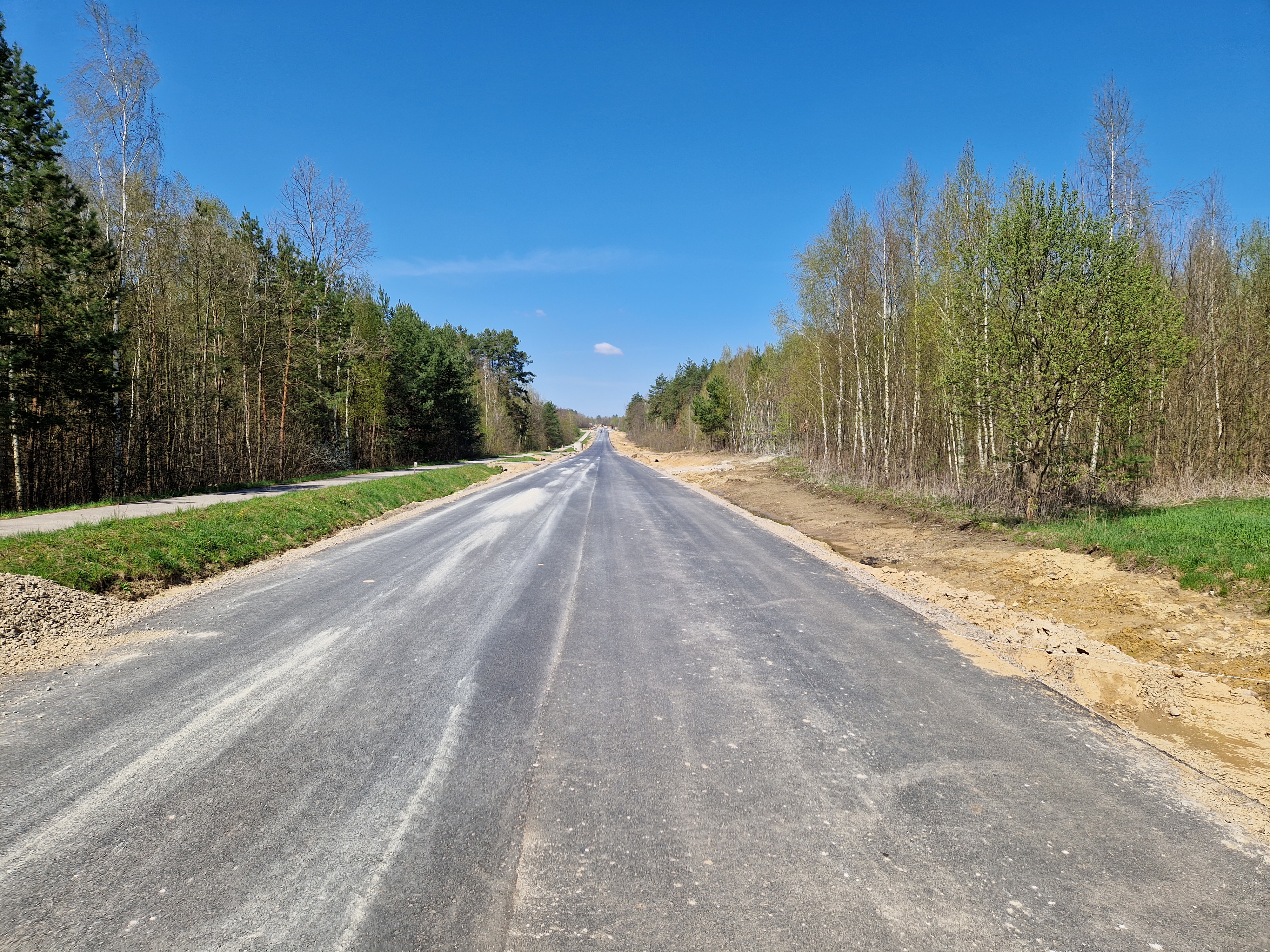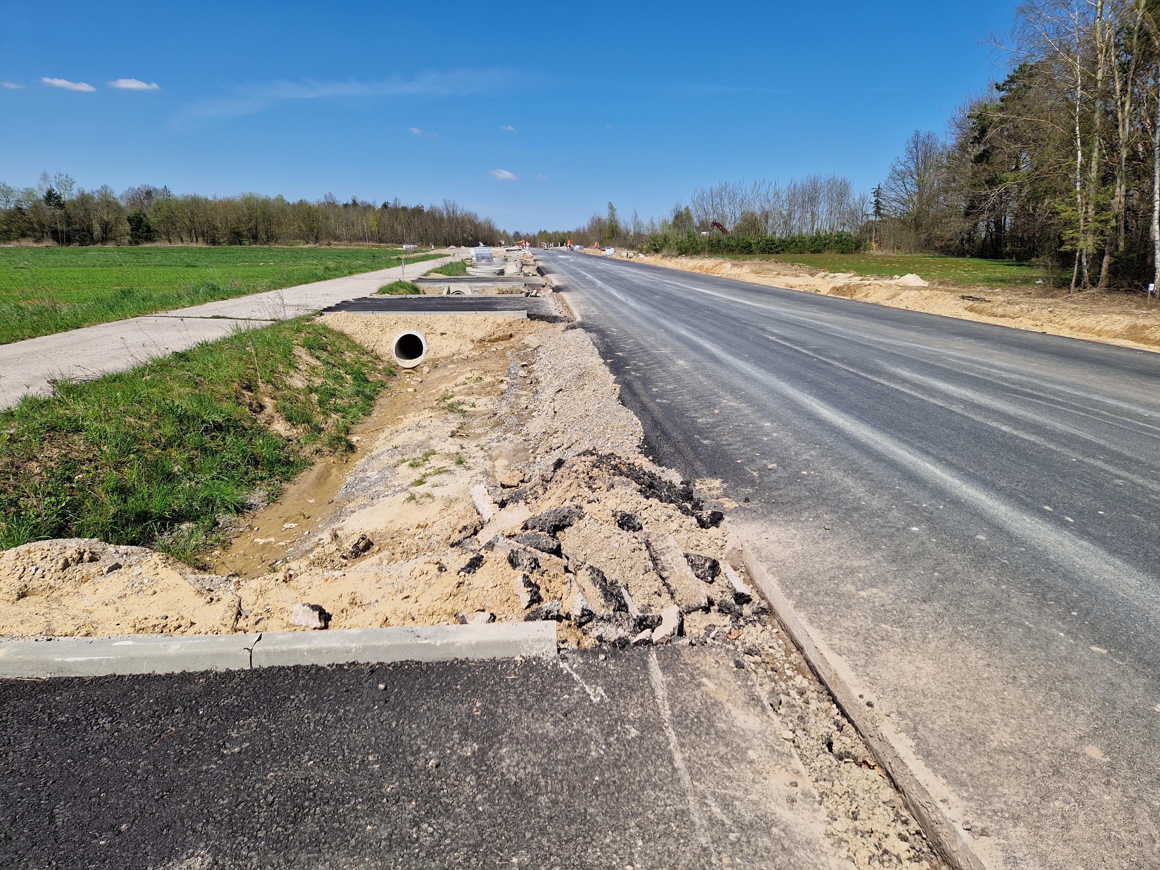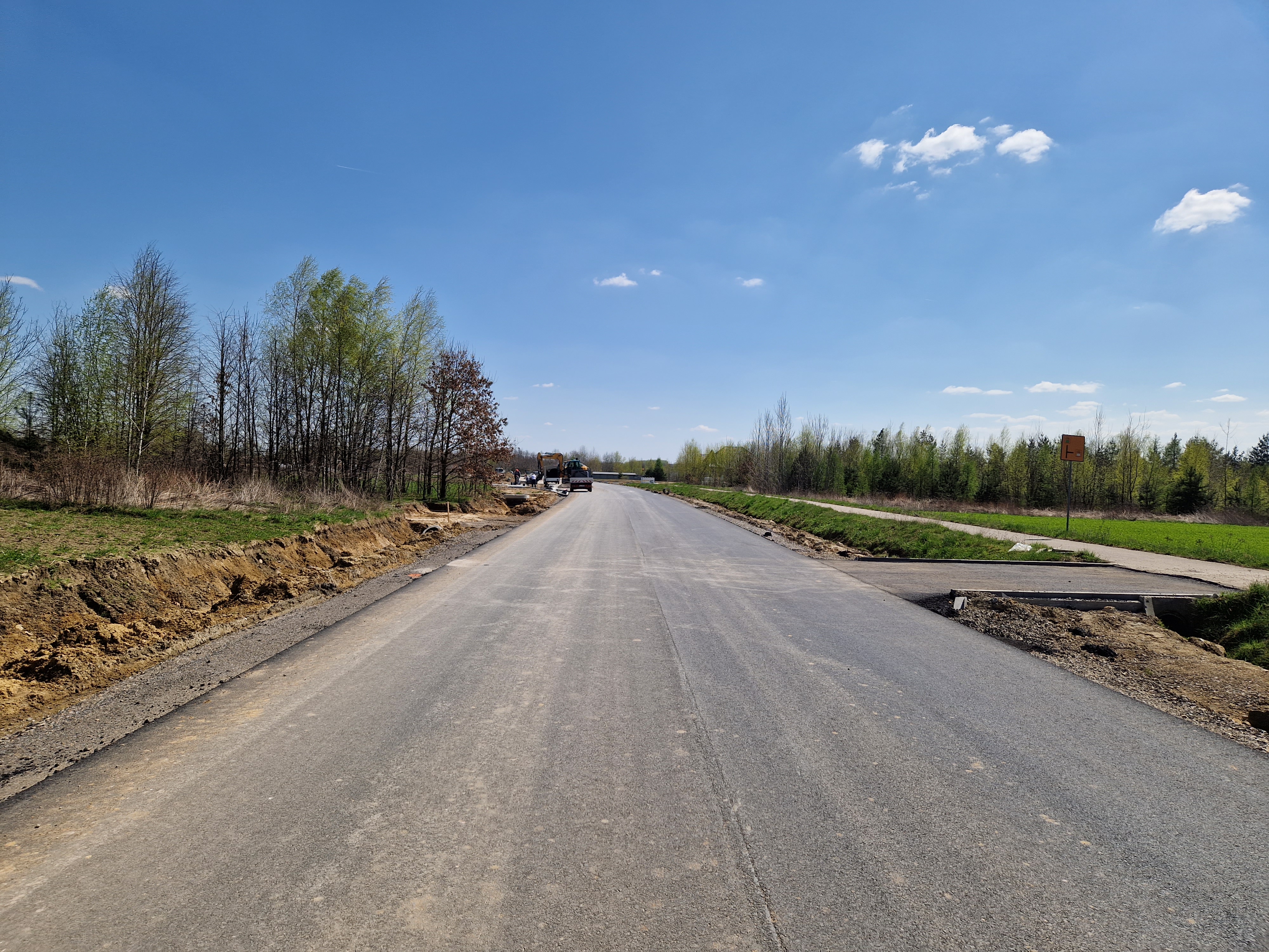 Warstwa bitumiczna ułożona już na większej części drogi. Postęp prac w kwietniu