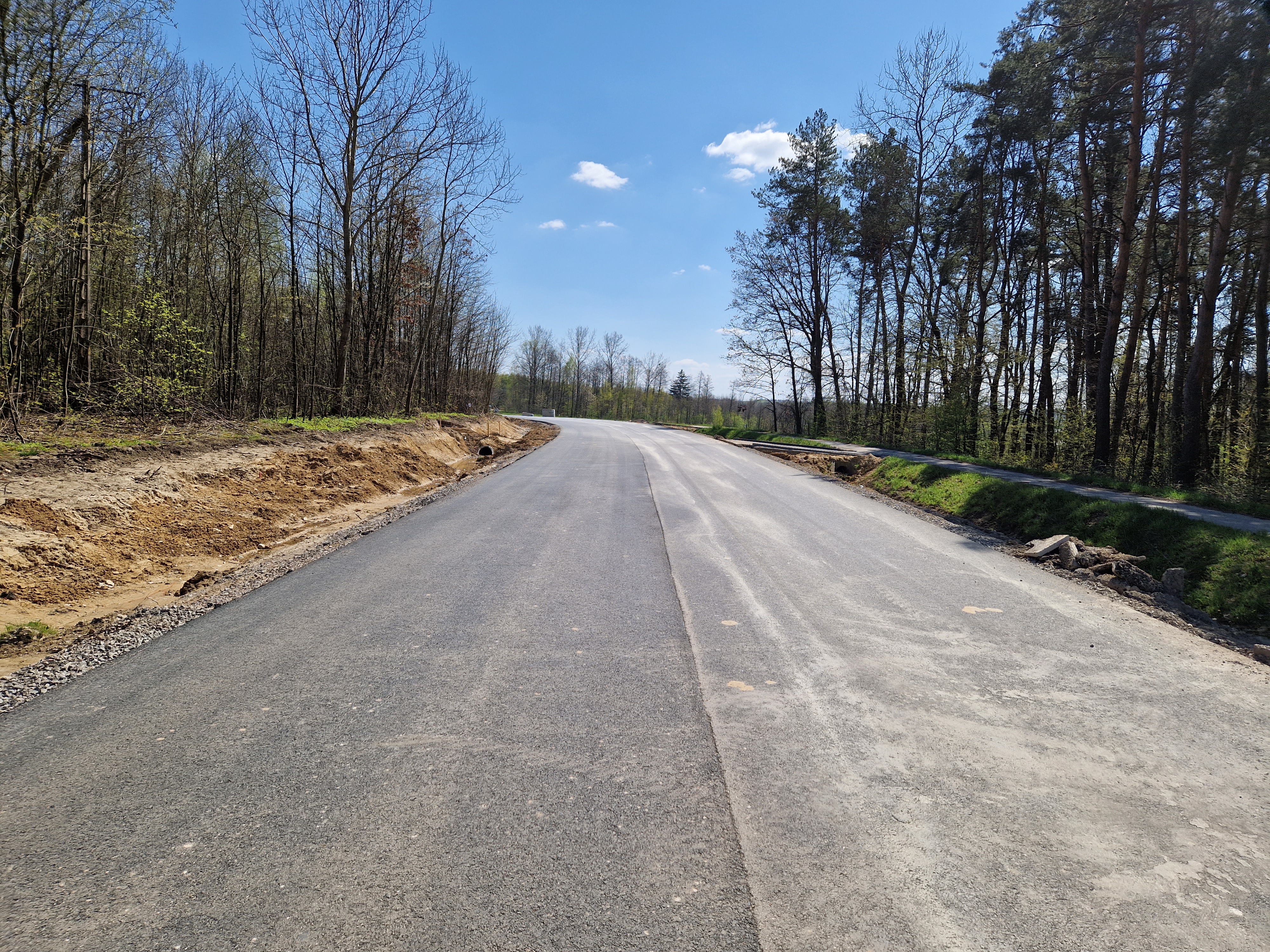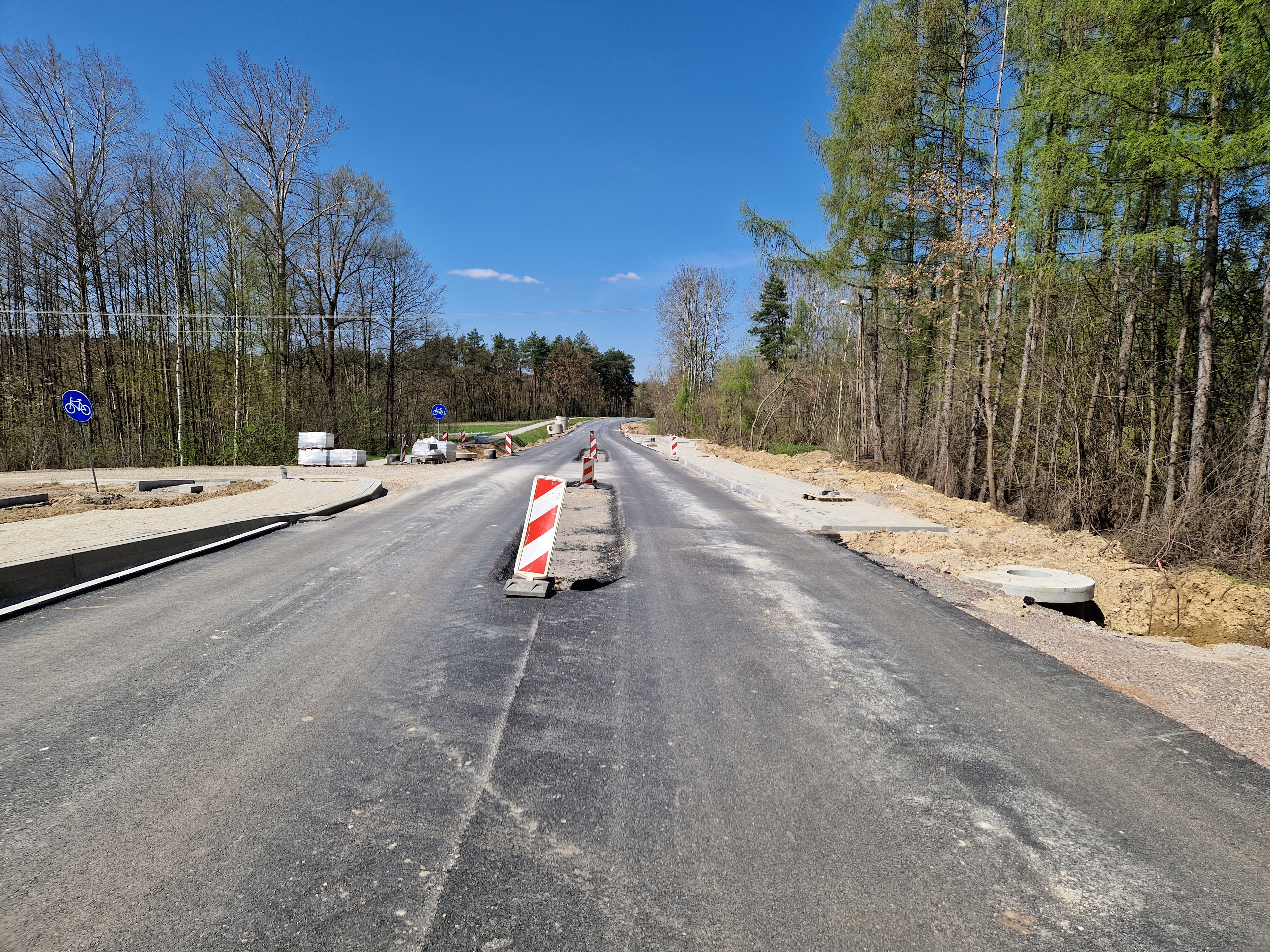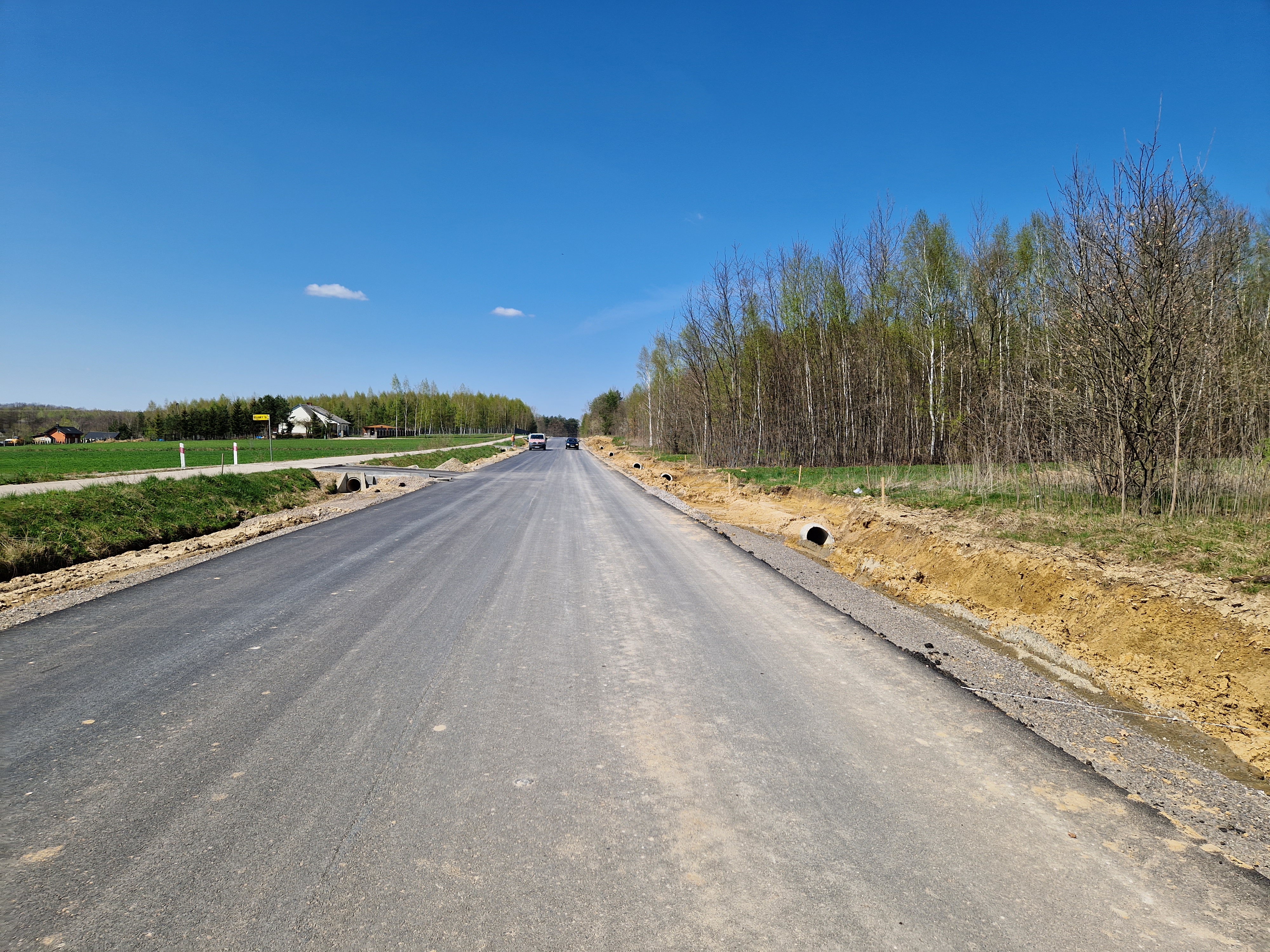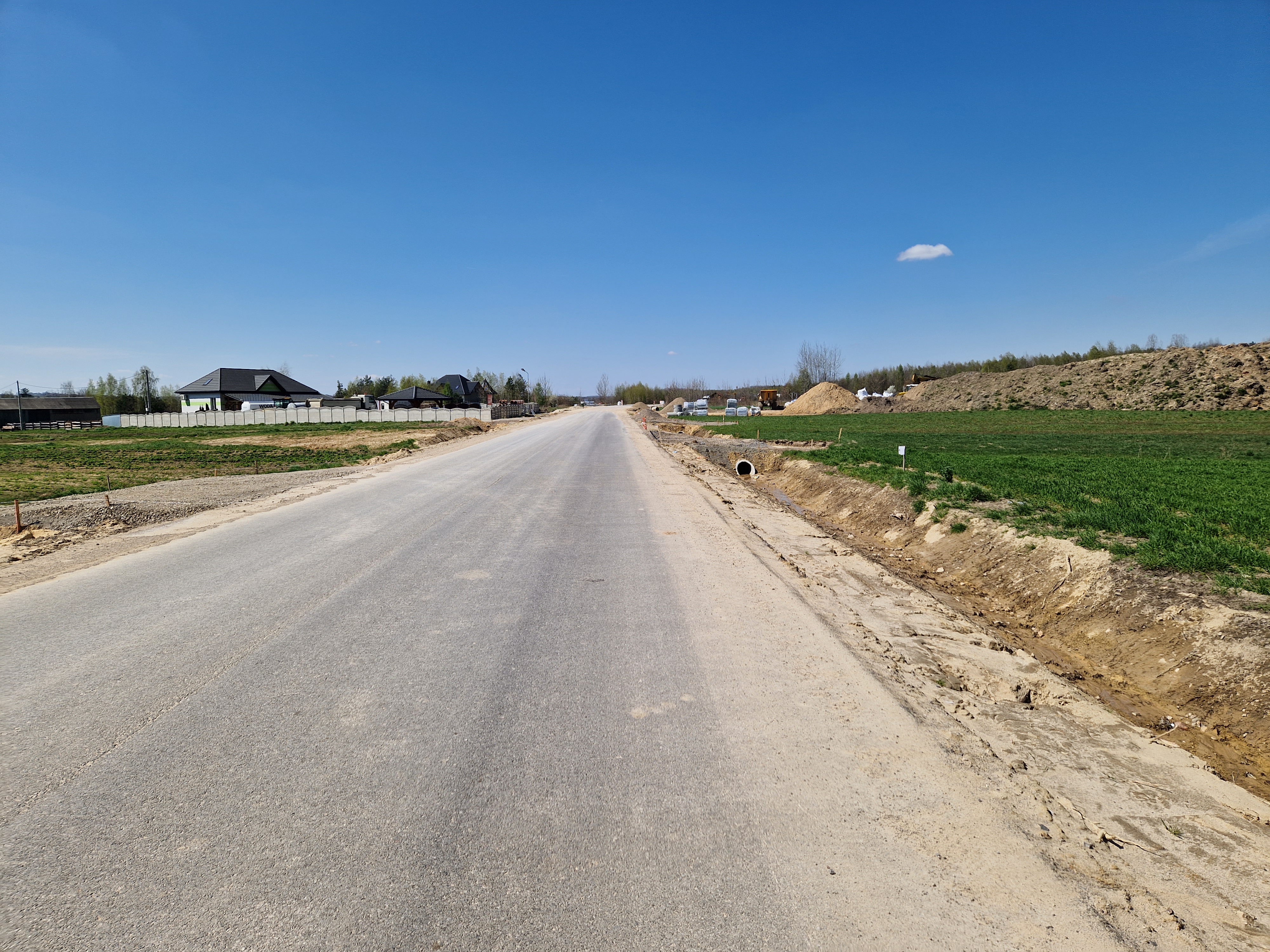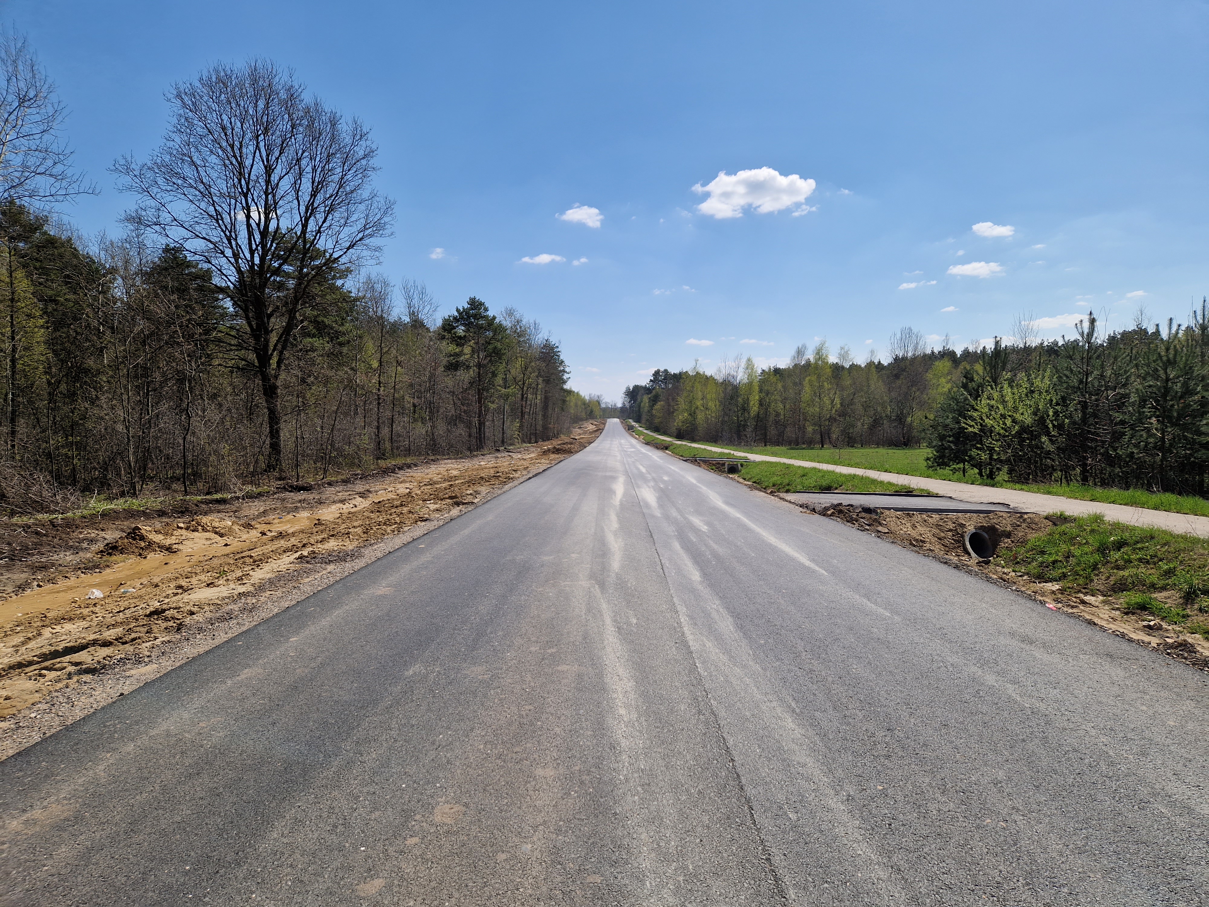 Warstwa bitumiczna ułożona już na większej części drogi. Postęp prac w kwietniu
