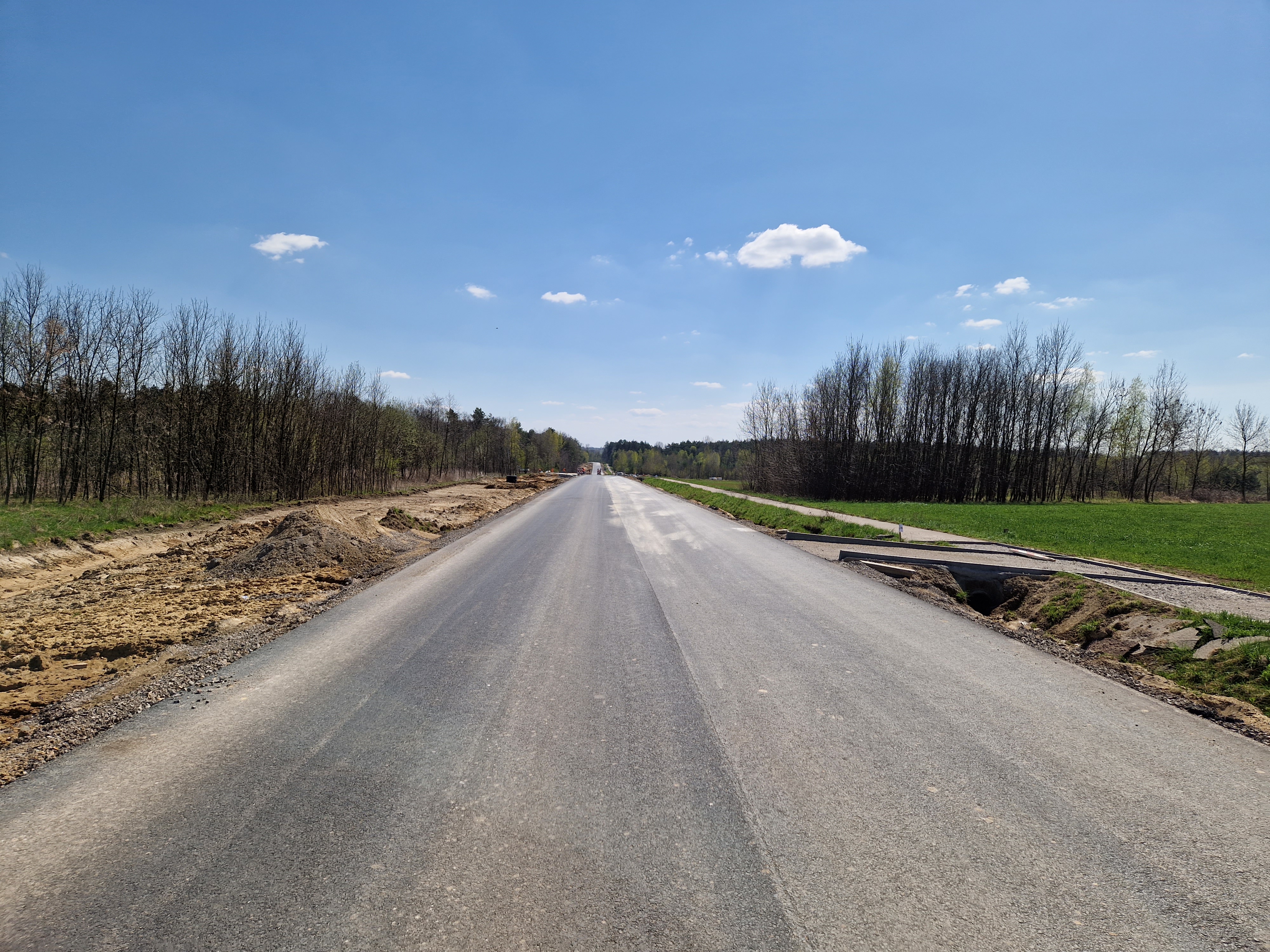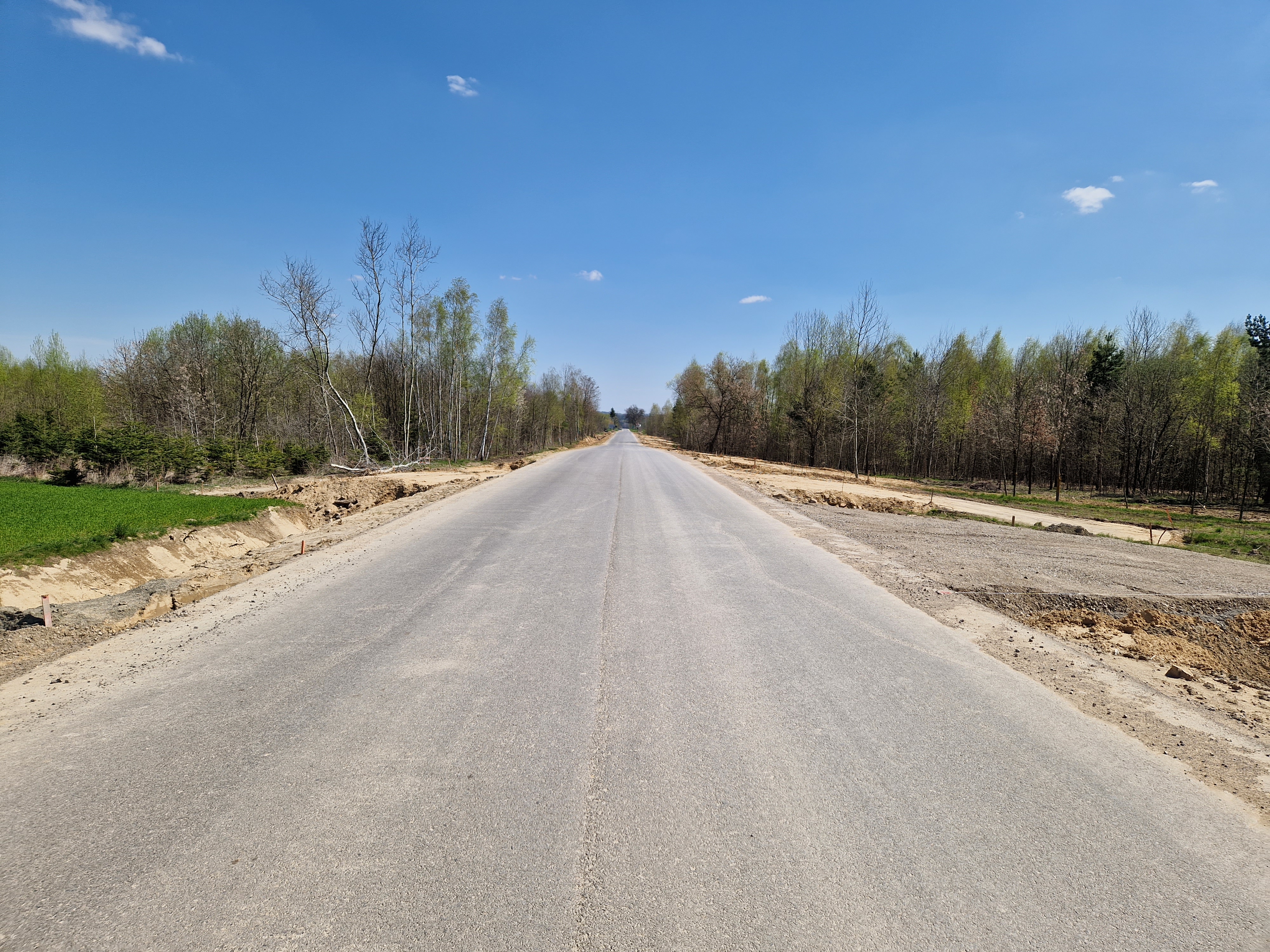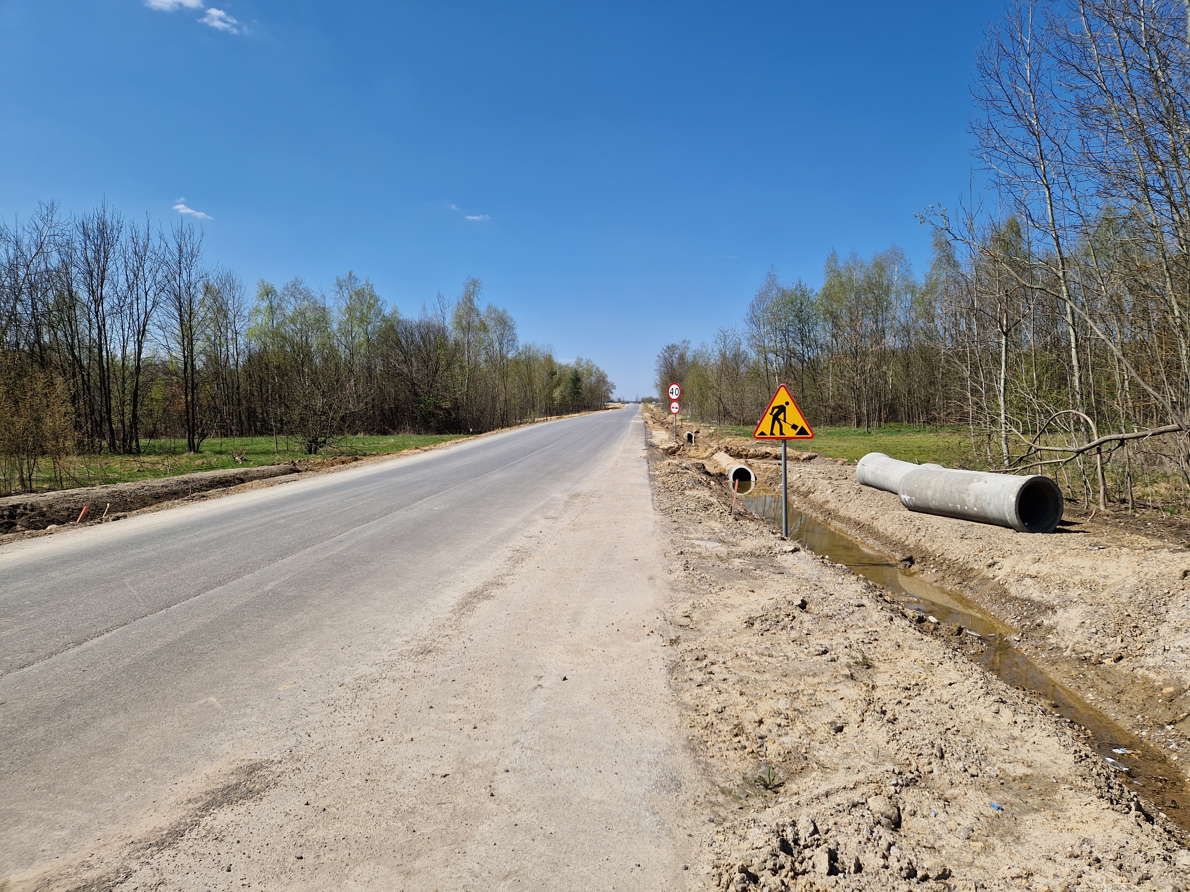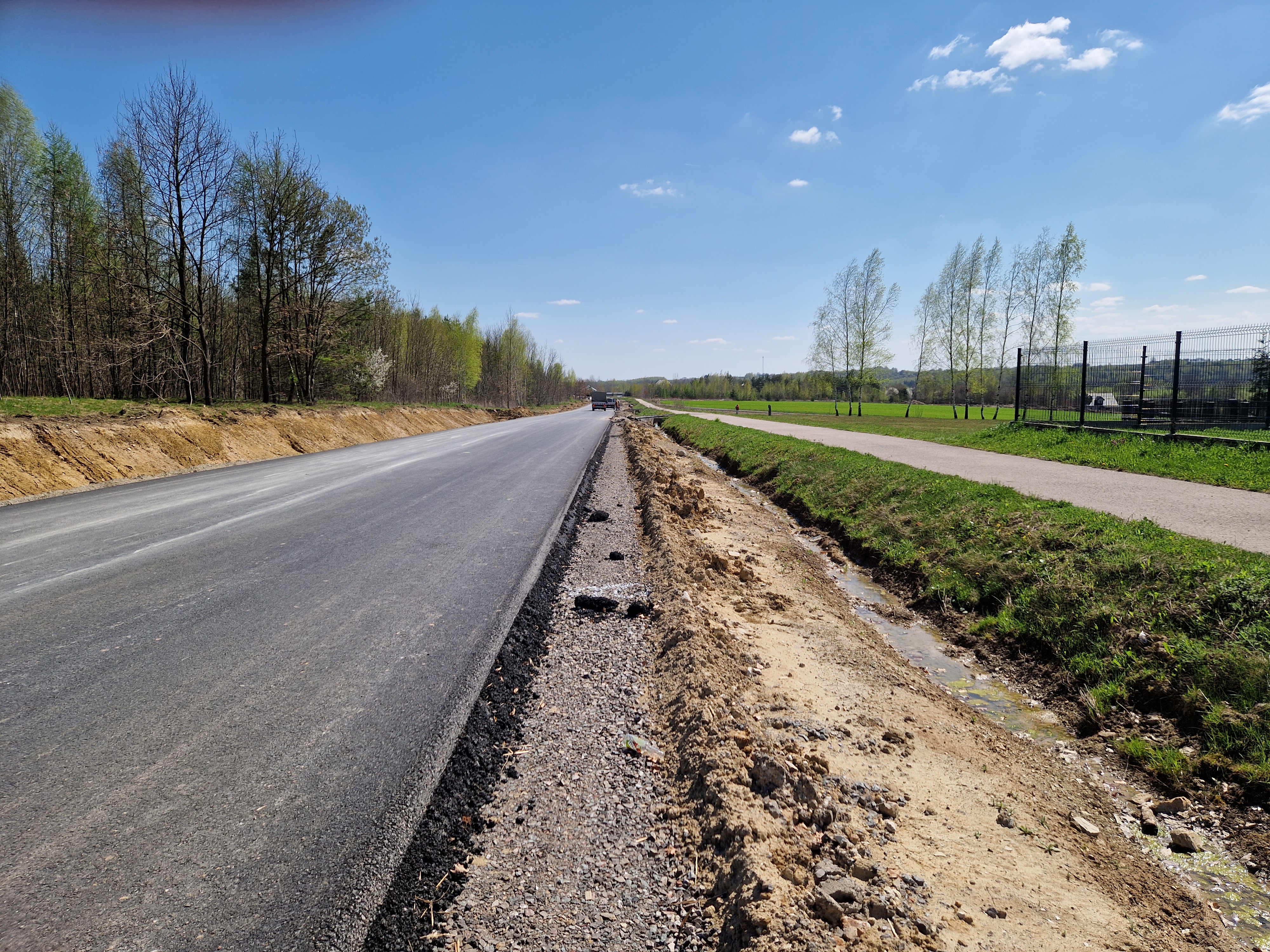 Warstwa bitumiczna ułożona już na większej części drogi. Postęp prac w kwietniu