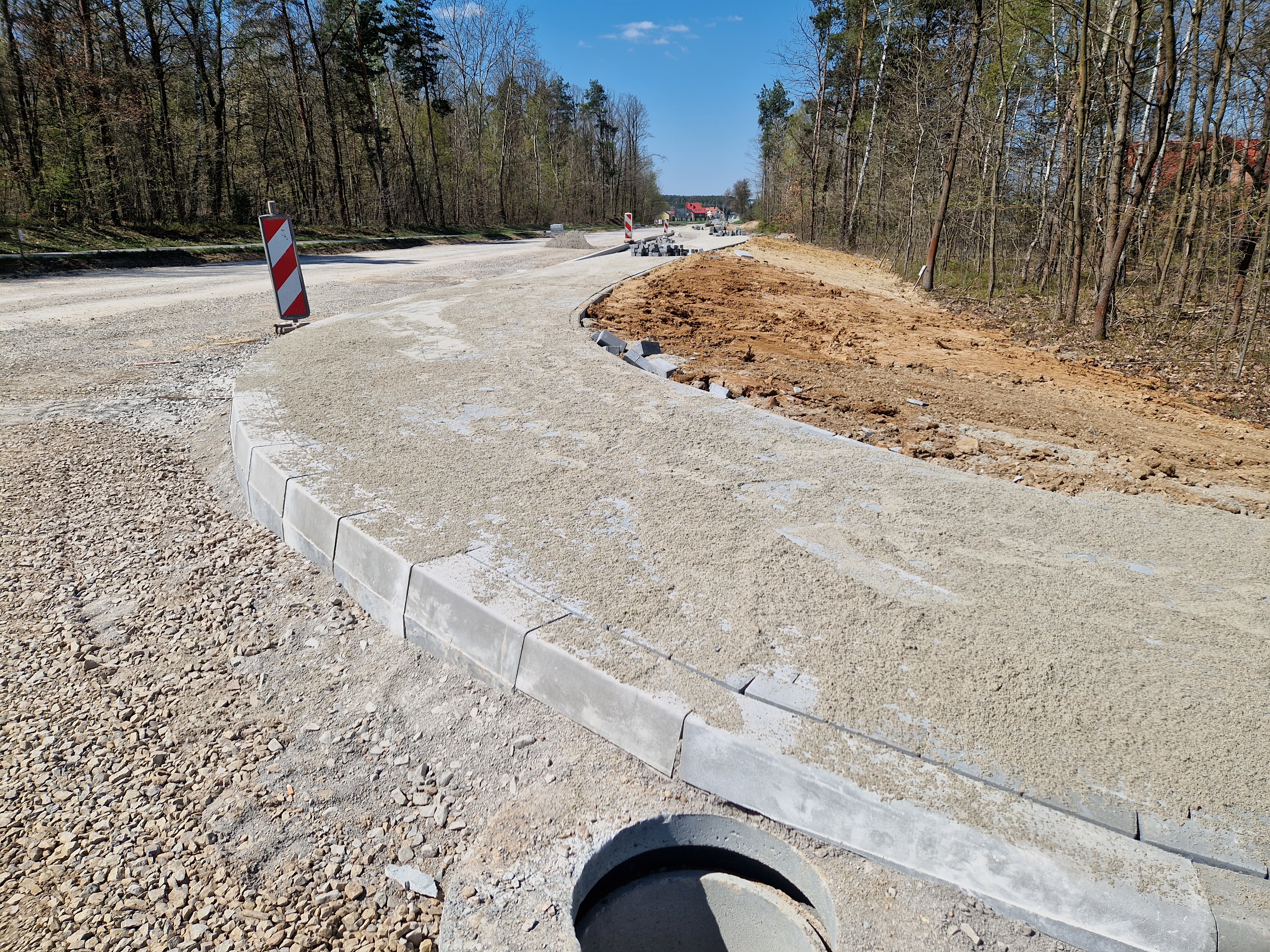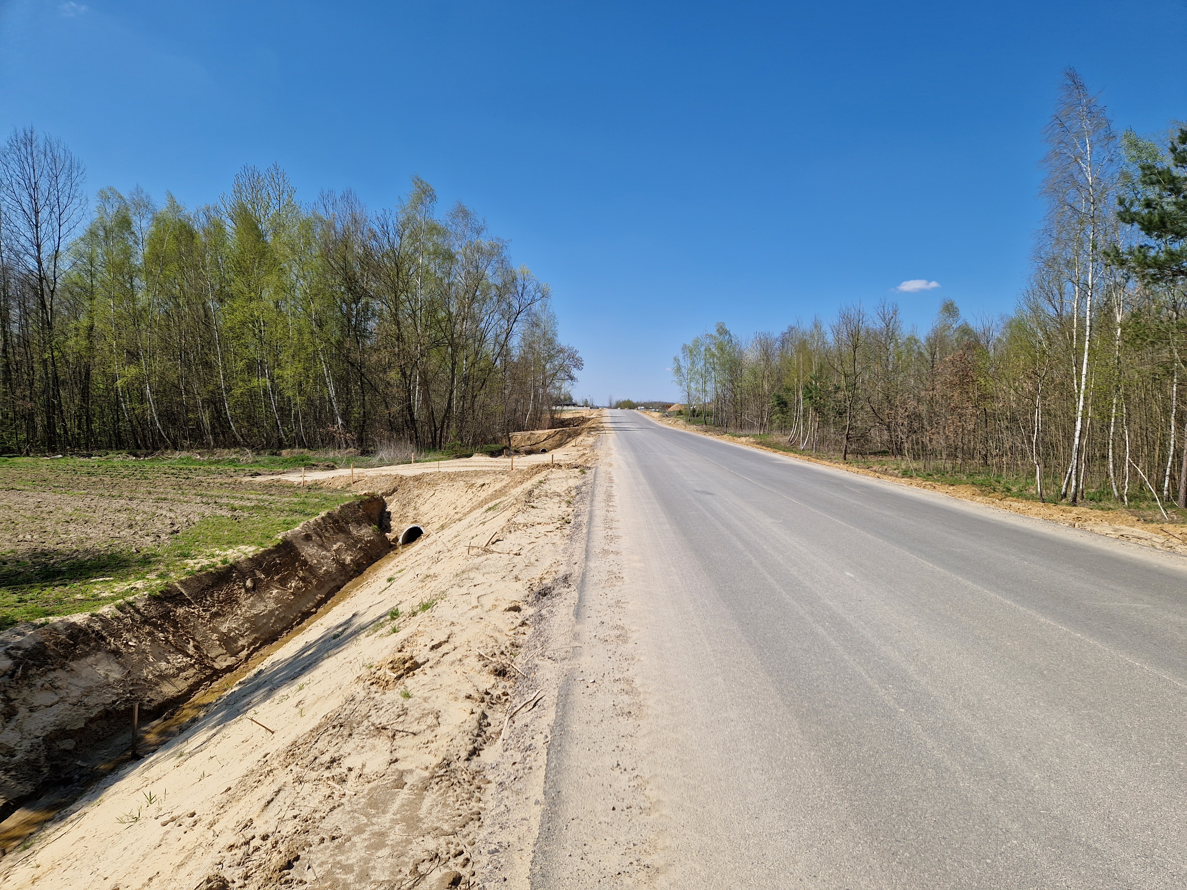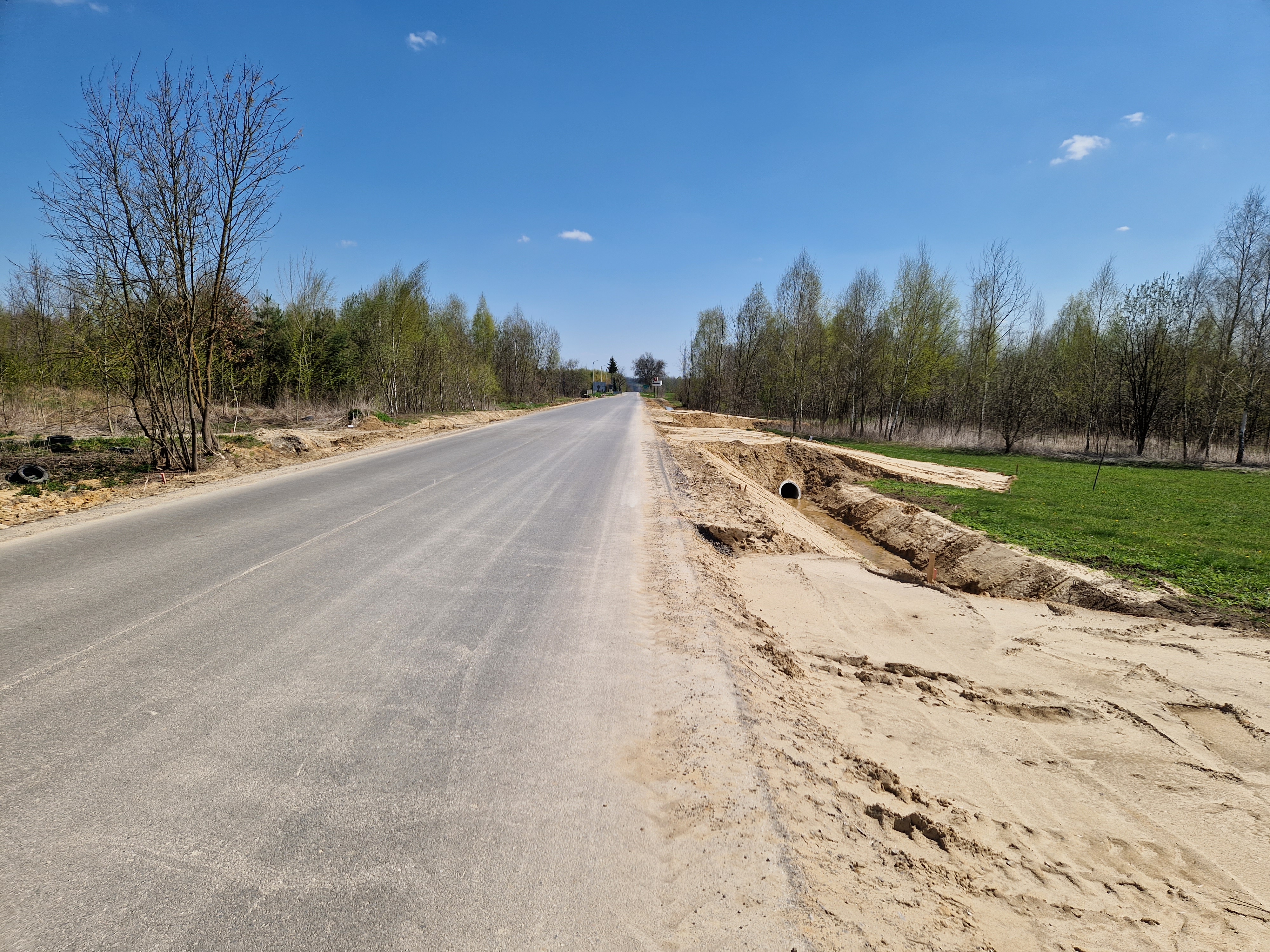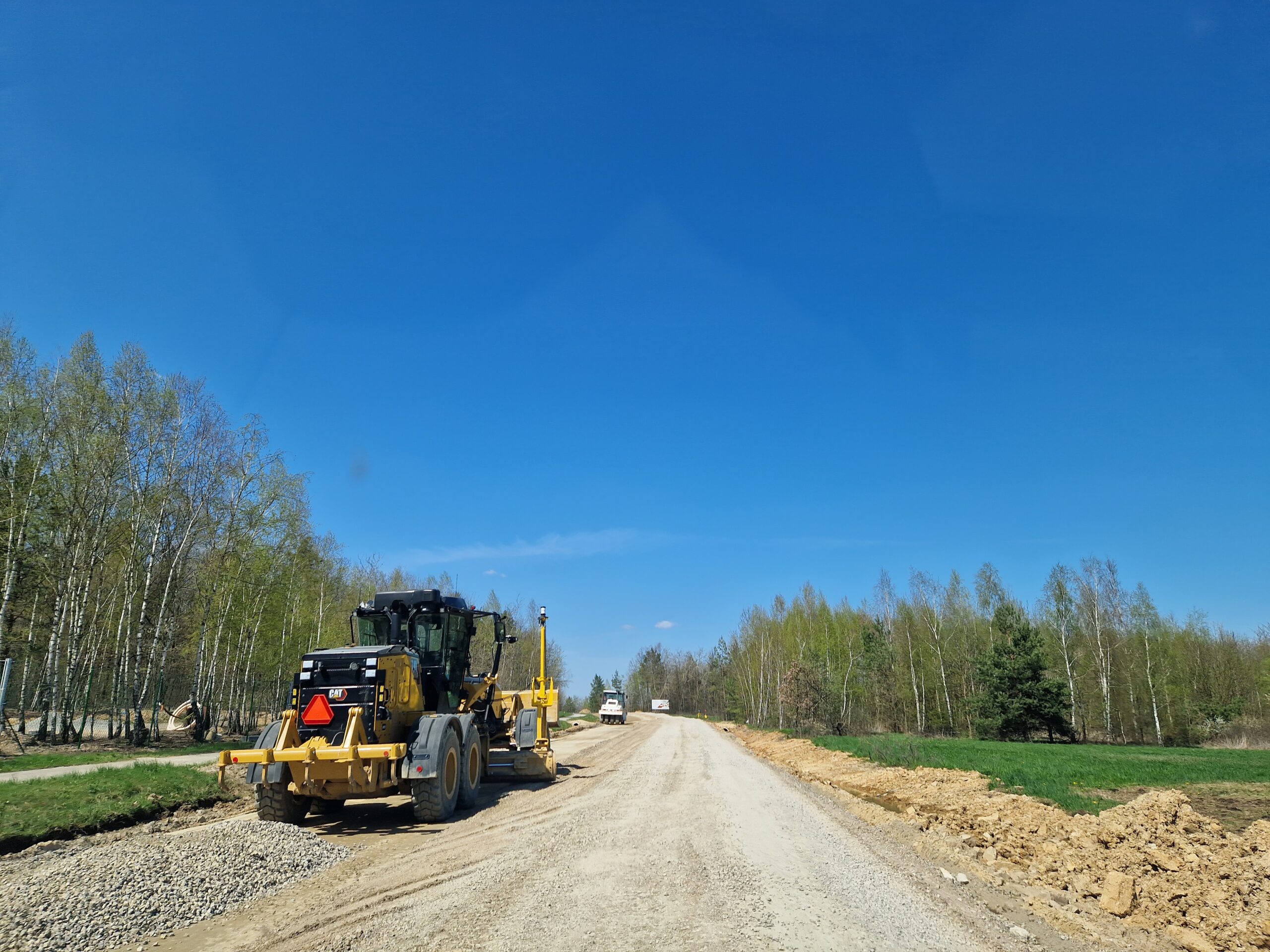 Prace przy budowie odwodnienia drogi, przygotowanie podbudowy pod warstwy bitumiczne. Postęp prac w marcu