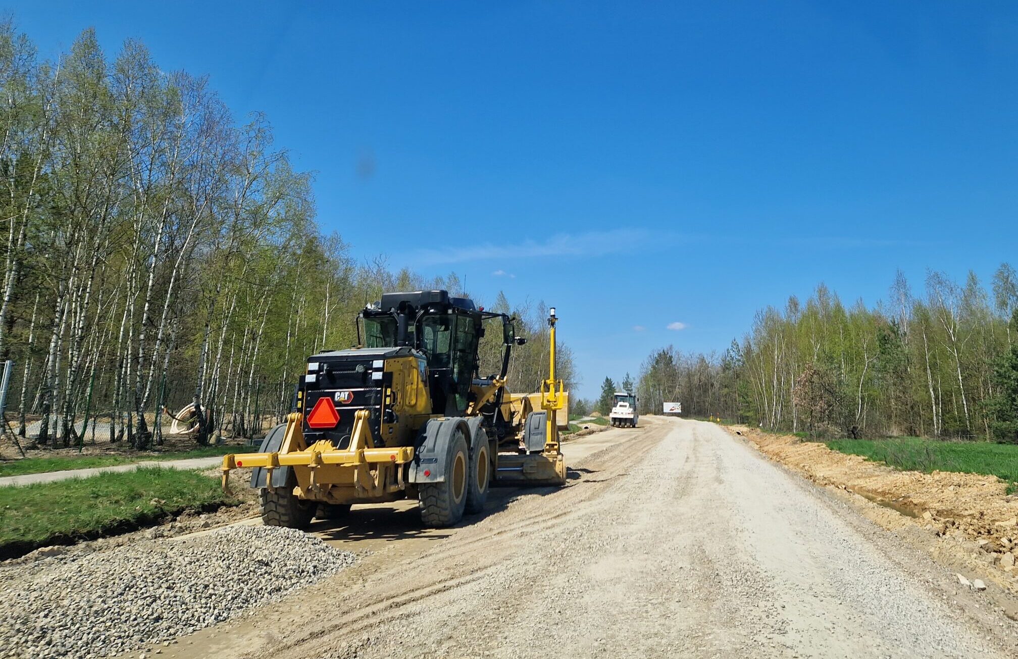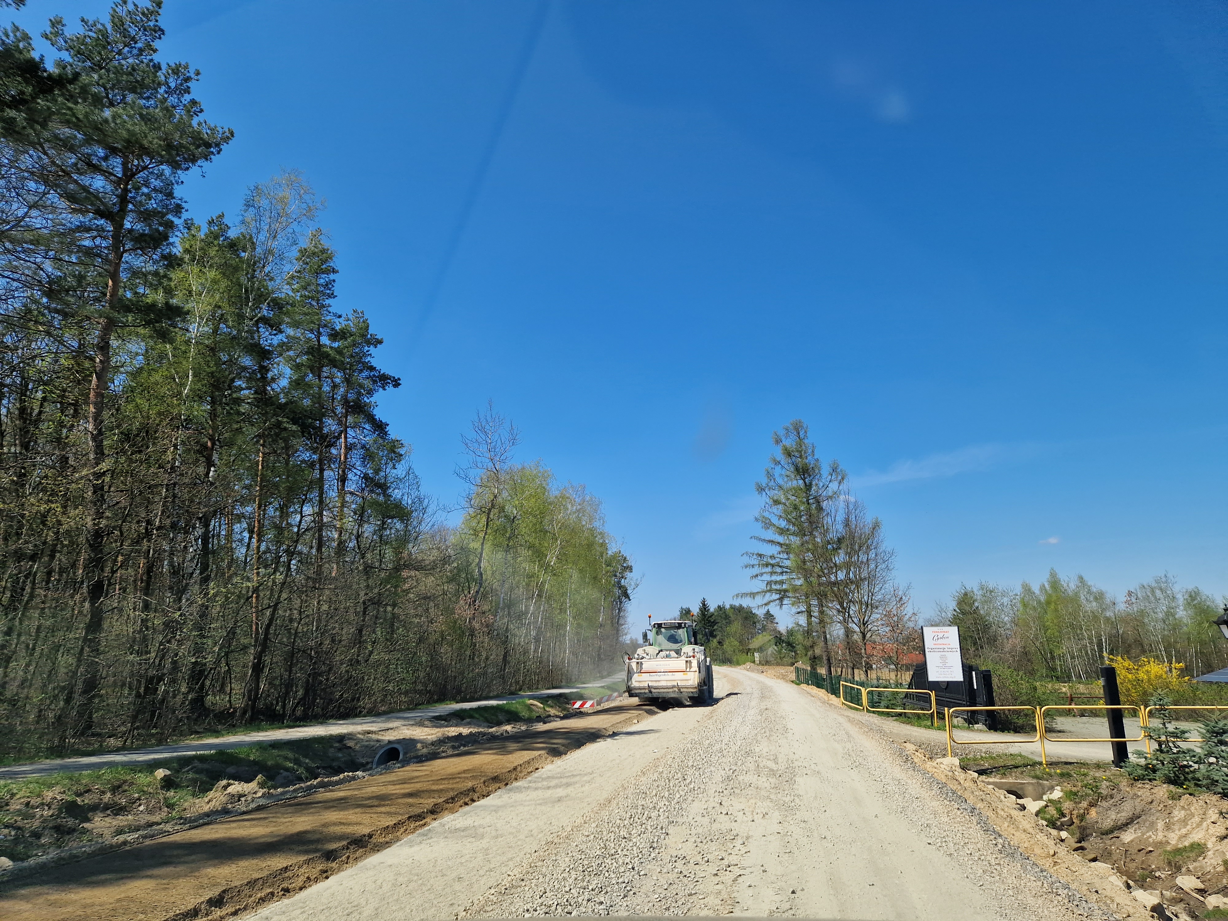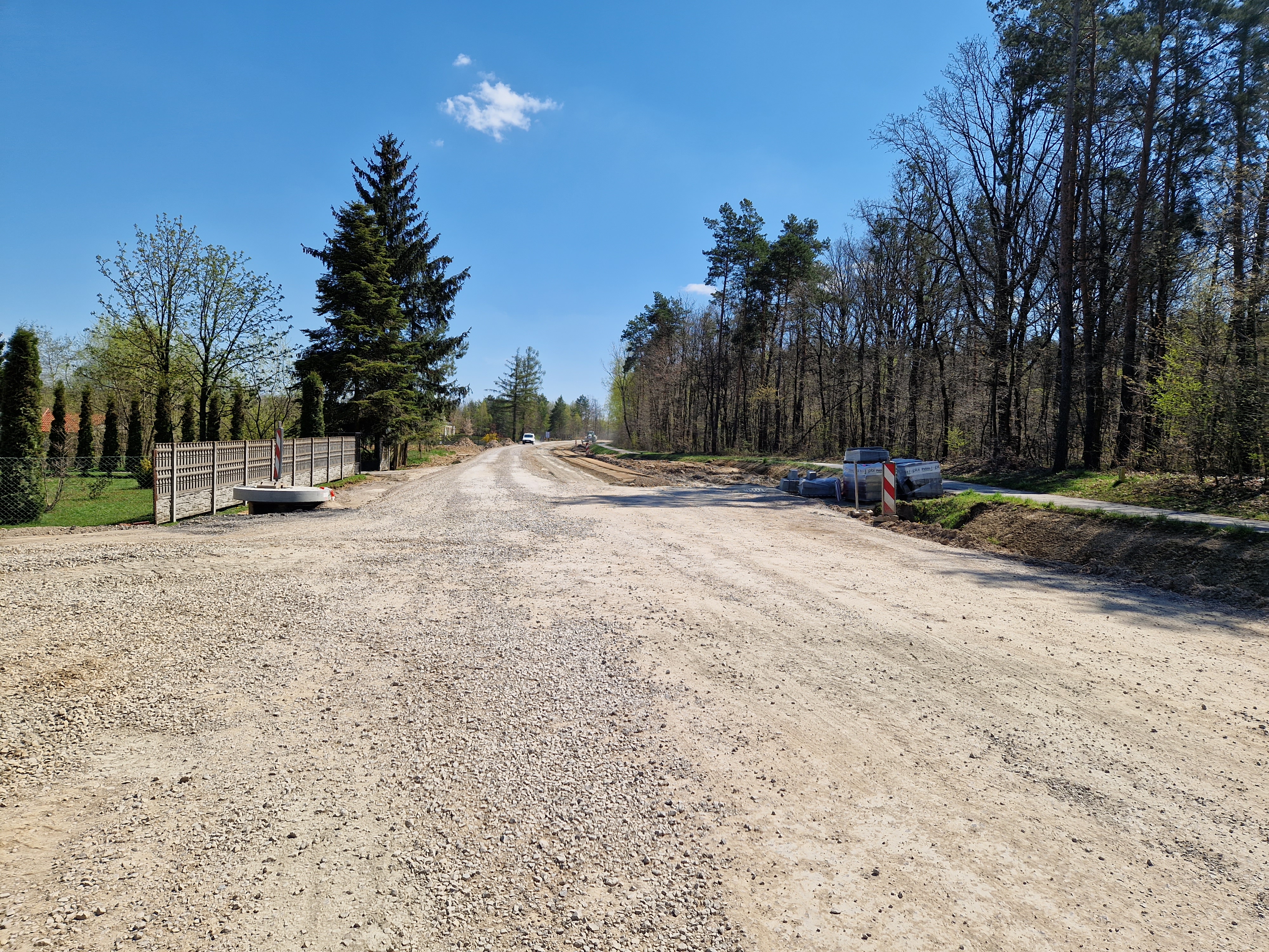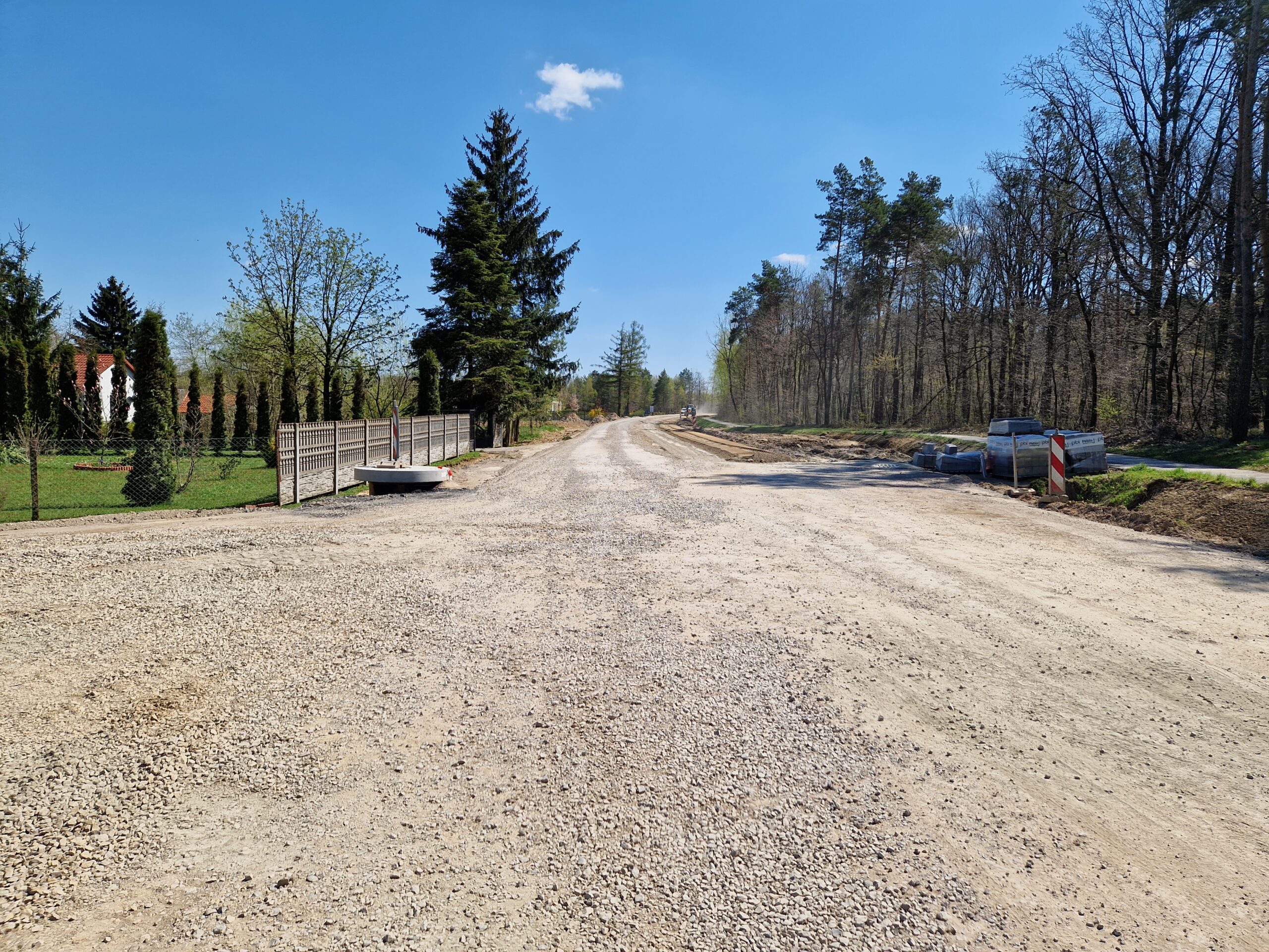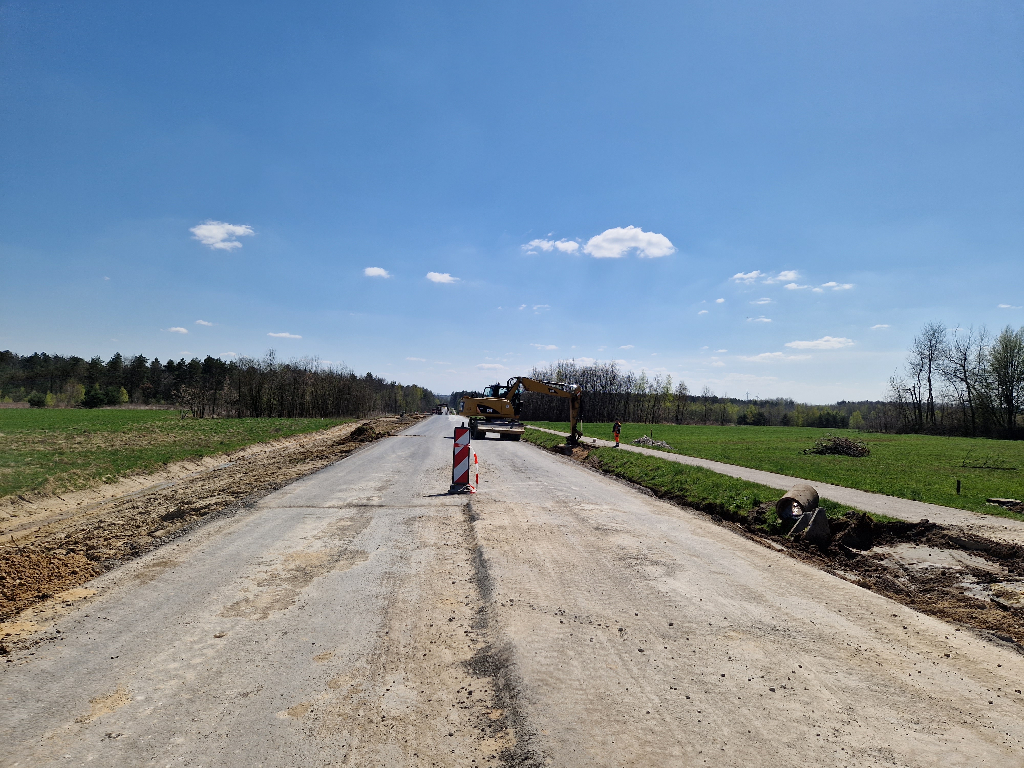 Prace przy budowie odwodnienia drogi, przygotowanie podbudowy pod warstwy bitumiczne. Postęp prac w marcu